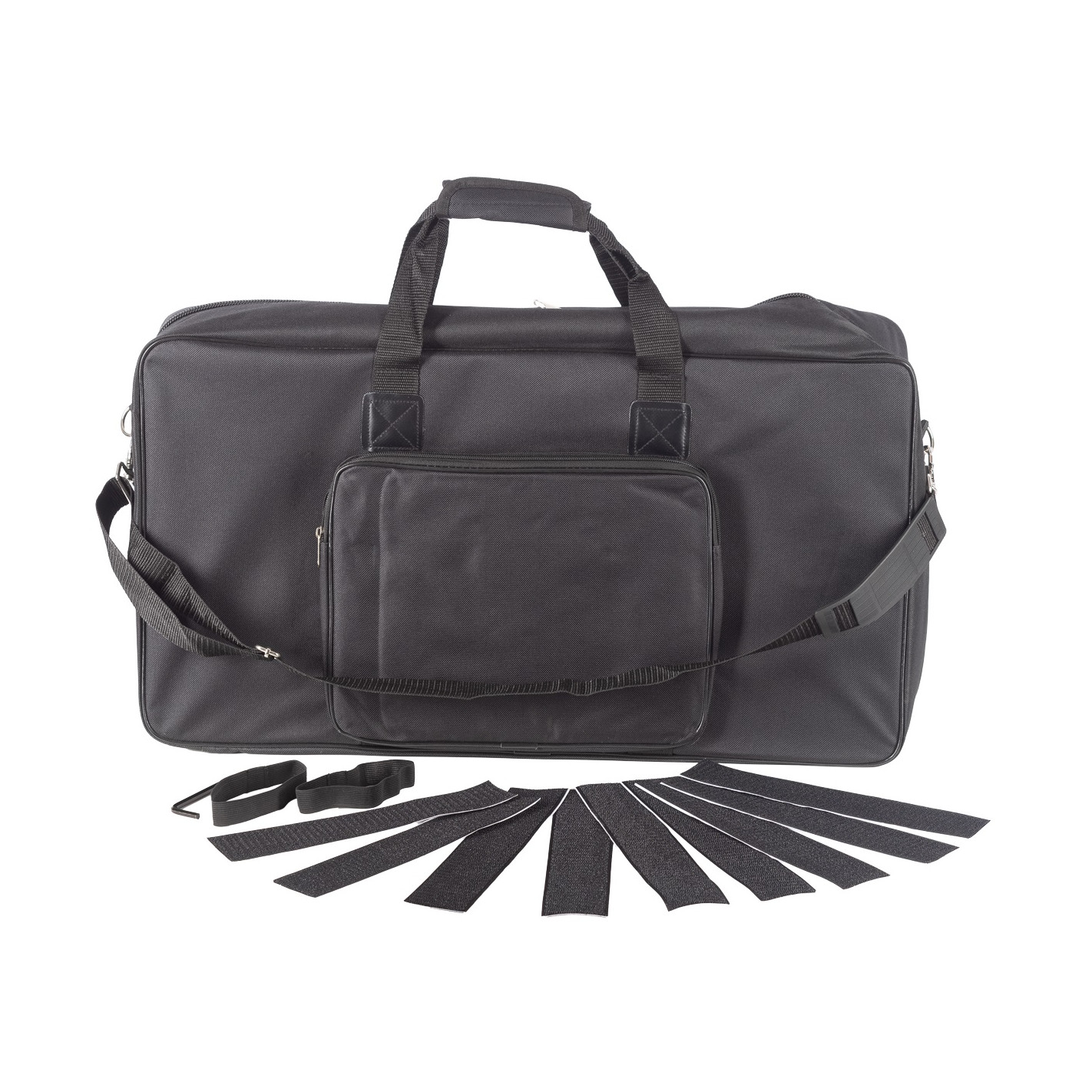 GS052M Estructura robusta de aluminio. Cuatro barras transversales recubiertas de velcro. Funda acolchada con bolsillo y correa para el hombro. 9 Cintas de velcro de 52 x 250 mm. 2 Bandas de goma fuertes para fijar la fuente de alimentación. Medidas: 596 x 305 x 95 mm.