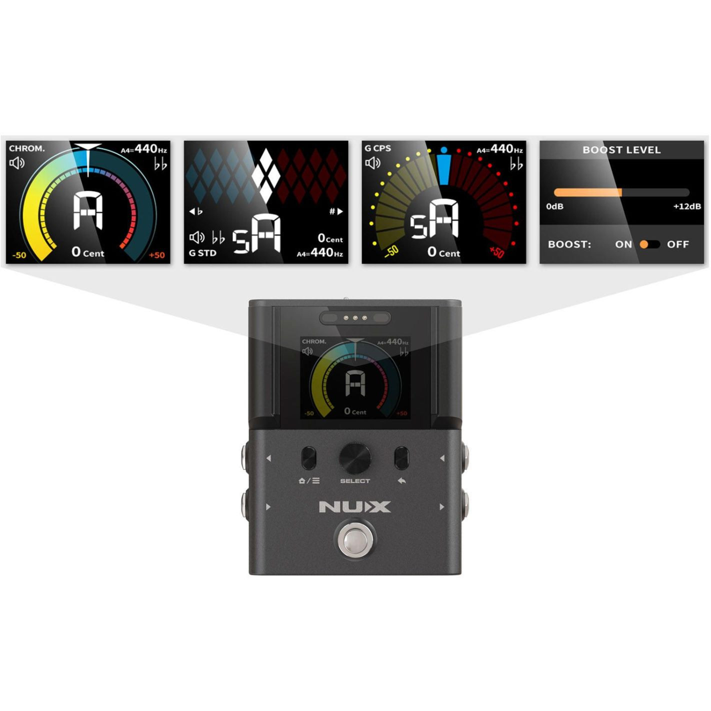 - Modos de afinación: Cromática, guitarra estándar, guitarra con compensación y bajo