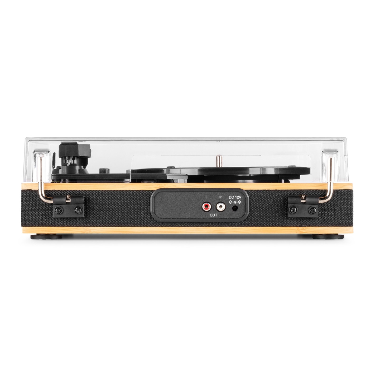 Tocadiscos Bluetooth con 2 altavoces, acabado en color bambú.
