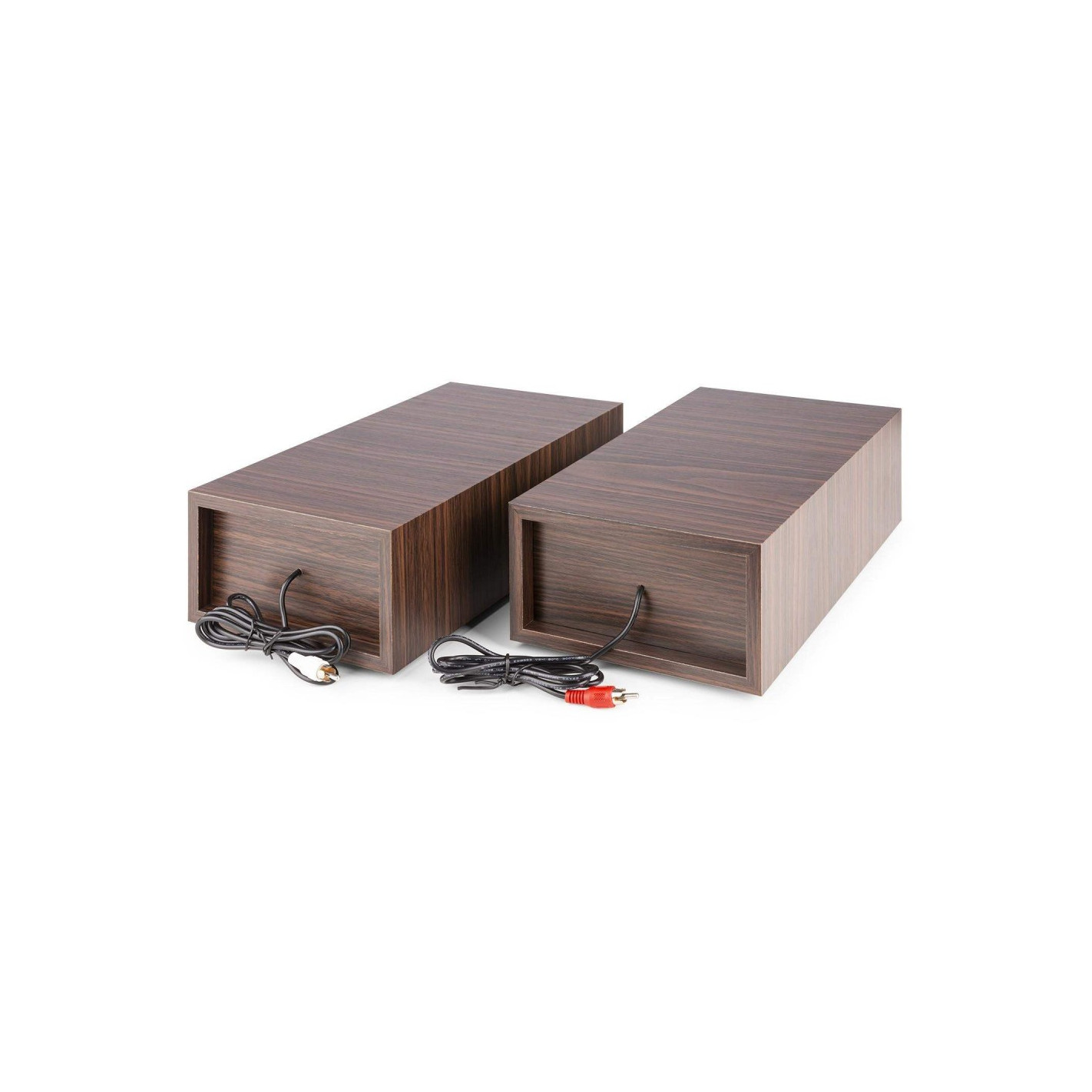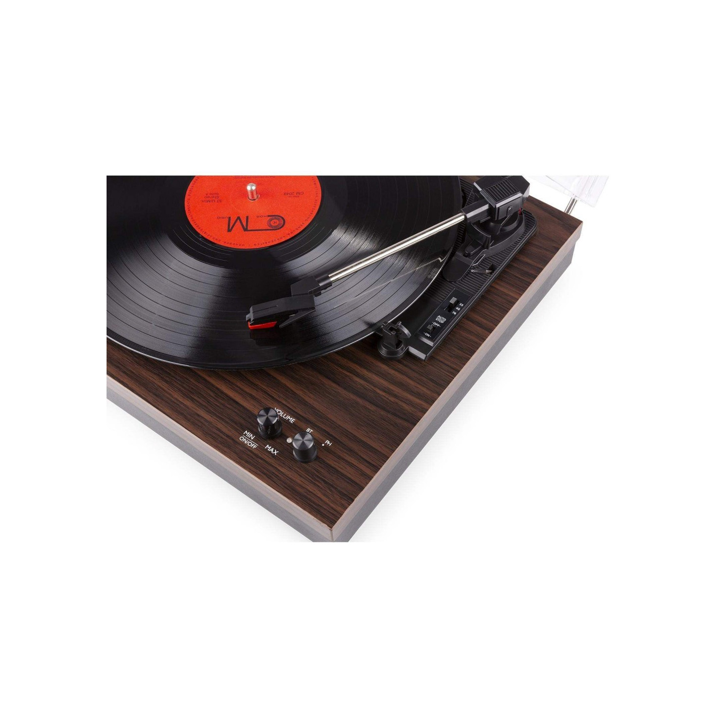 Plato giradiscos con amplificación y Bluetooth, 2 altavoces de 50 Watts, en madera oscura.