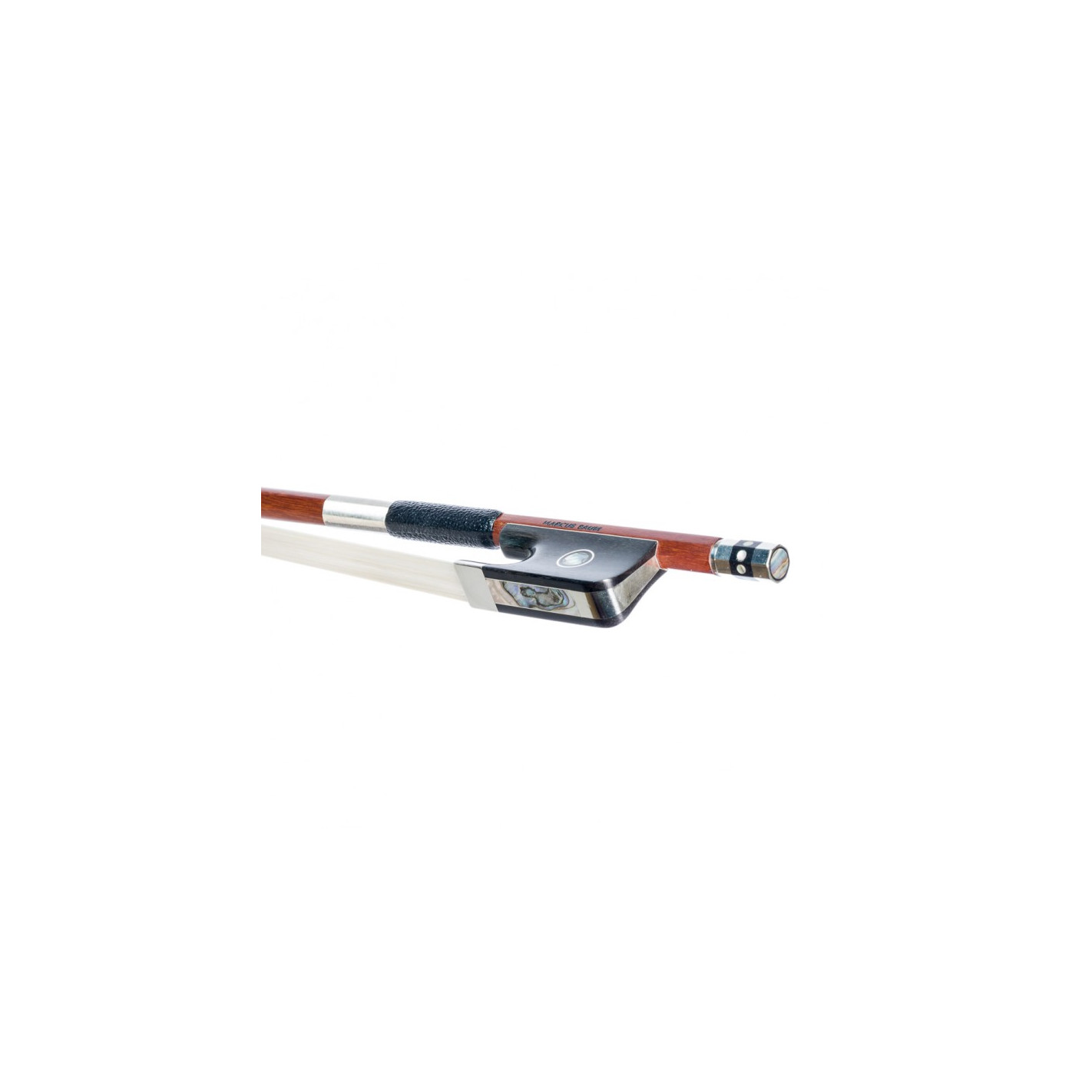Arco de taller de escogida madera de Pernambuco de primera calidad, material muy popular en la fabricación de arcos desde finales del siglo XVIII y que posee la combinación perfecta de fuerza, elasticidad y capacidad de respuesta. Este arco de vara redonda está fabricado bajo altos estándares de calidad, y ha sido desarrollado con la ayuda de músicos de cuerda profesionales, ofreciendo una gran relación calidad-precio en su rango. El botón está embellecido con ojo simple y con ocho incrustaciones.