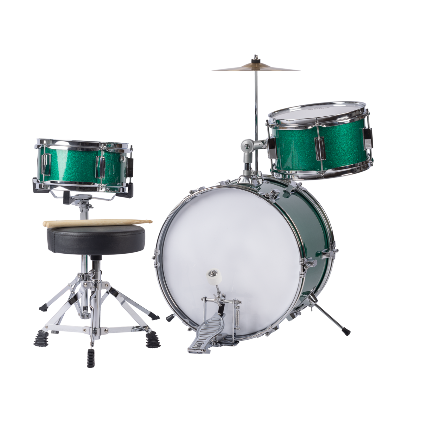 Bateria Infantil de 3 piezas, con 1 plato y sillín, en color verde.