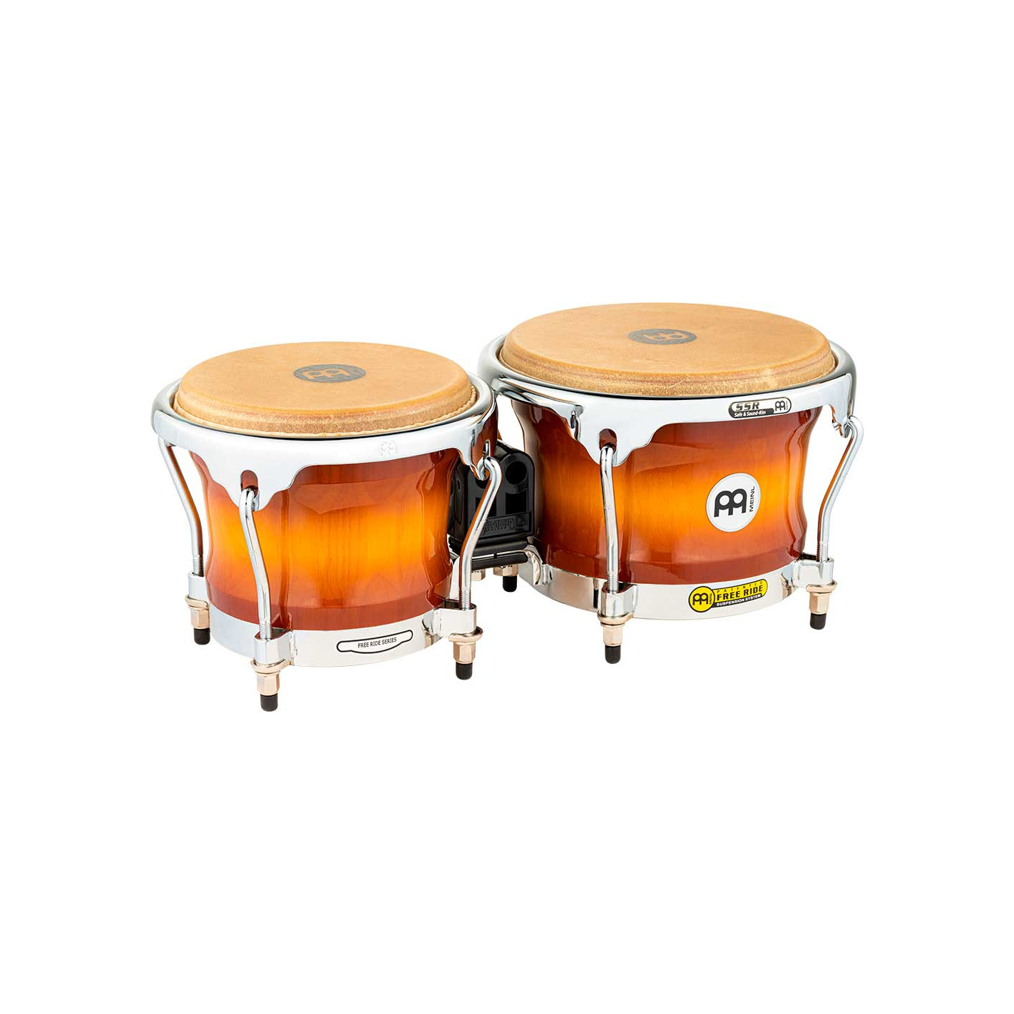 BONGOS 'Set de bongós acabado Gold Amber Sunburst (7'' y 8 1/2''). Serie Profesional. Un excelente bongo con el innovador sistema Free Ride que no perfora los cascos aumentado así la resonancia y volumen. El cuerpo es de madera roble de Siam y los parches de piel de búfalo seleccionada a mano. Además montan una pieza central patentada y de plástico que permite una sujeción total al pie de bongó si se requiriese.