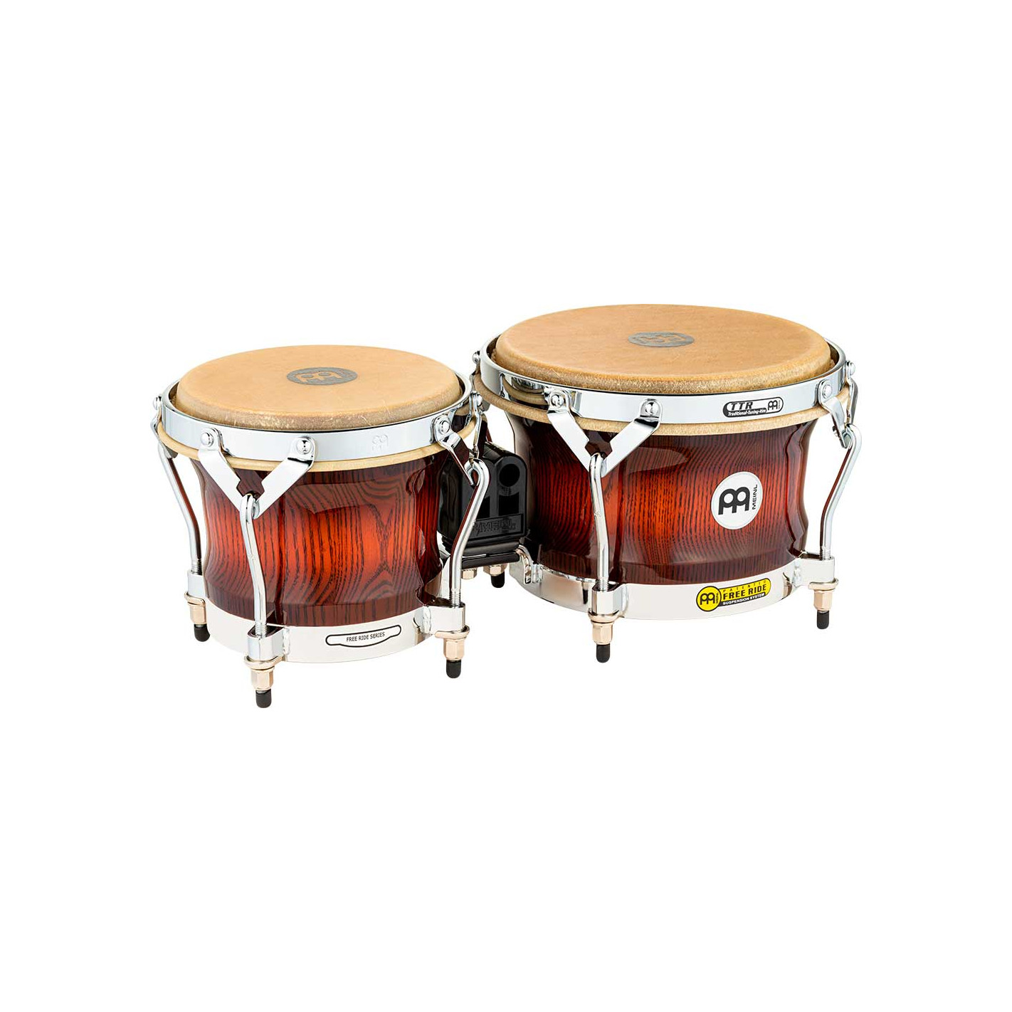 BONGOS 'Set de bongós acabado Antique Mahogany Burst (7'' y 9''). Serie Woodcraft. Un excelente bongo con el innovador sistema Free Ride que no perfora los cascos aumentado así la resonancia y volumen. El cuerpo es de fresno americano y los parches de piel de búfalo seleccionada a mano. Además montan una pieza central patentada y de plástico que permite una sujeción total al pie de bongó si se requiriese.