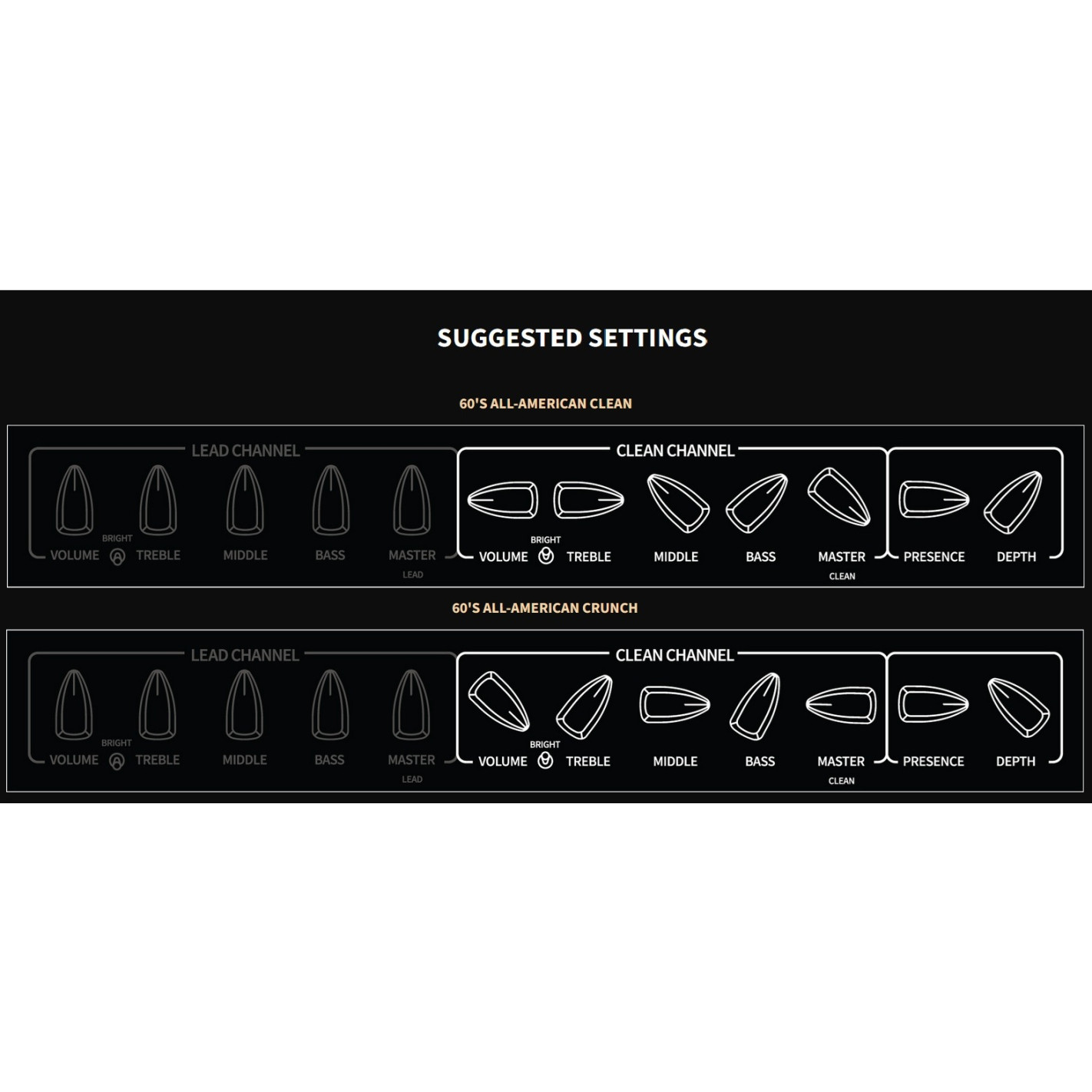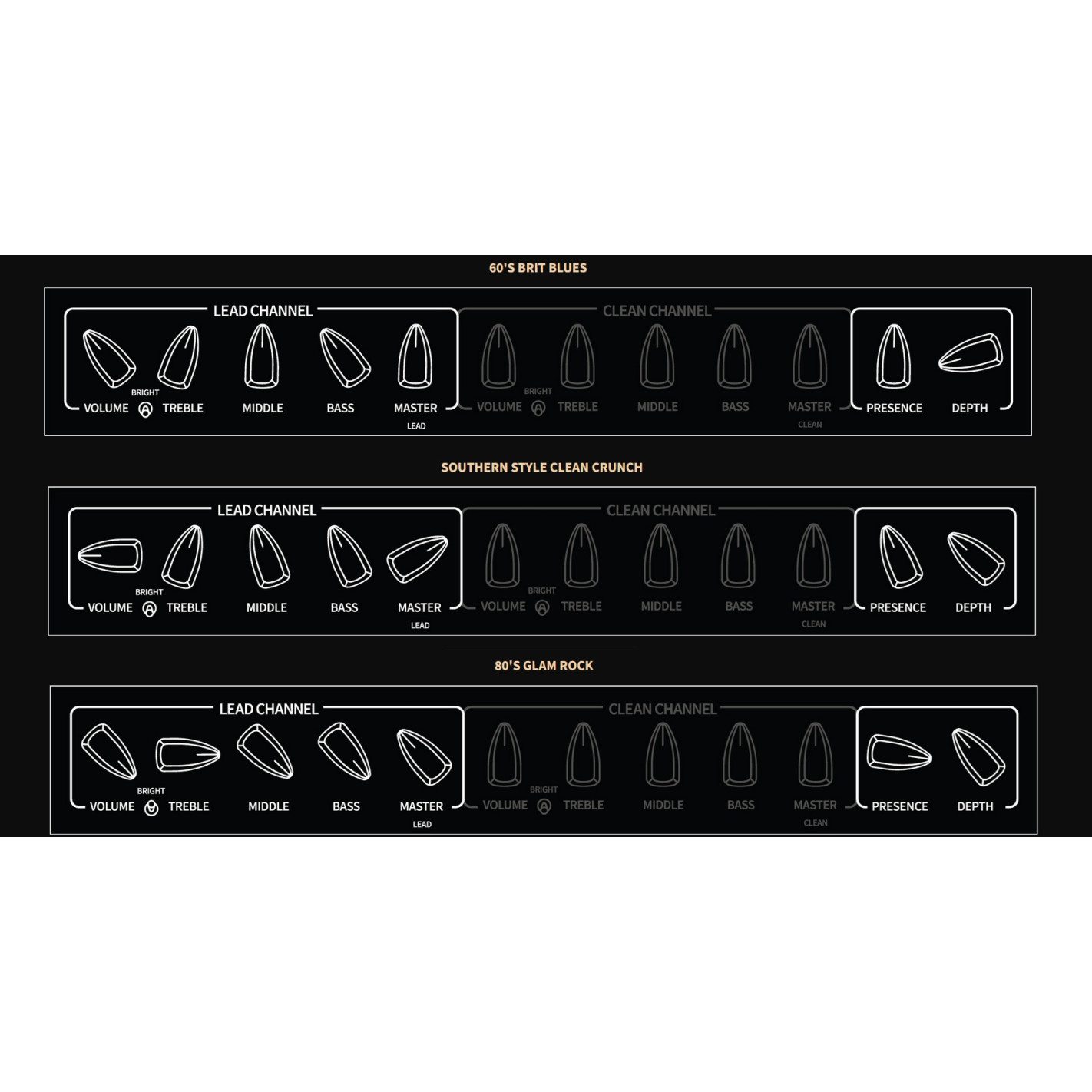 - Controles del Canal CLEAN: Volume, Bright Switch, Treble, Middle, Bass, Master Volume