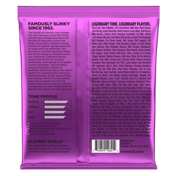 Las cuerdas Ernie Ball Slinky para bajo ofrecen una respuesta brillante y un tono equilibrado. Cada cuerda se fabrica minuciosamente con materiales de alta calidad en la factoría de Coachella Valley, en el sur de California. La lista de endorsers de las cuerdas Slinky, nos da una idea de su rendimiento. Cuerdas .050, .070, .085, .105 .135.
