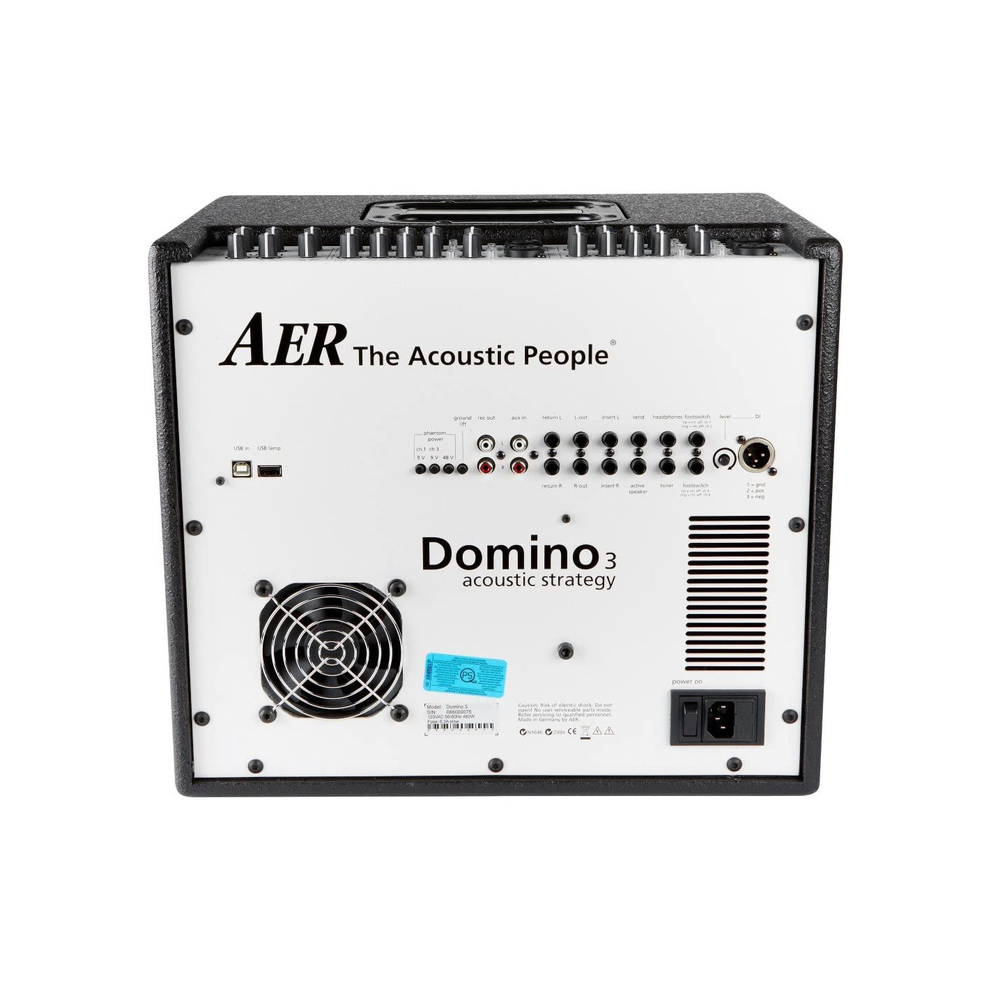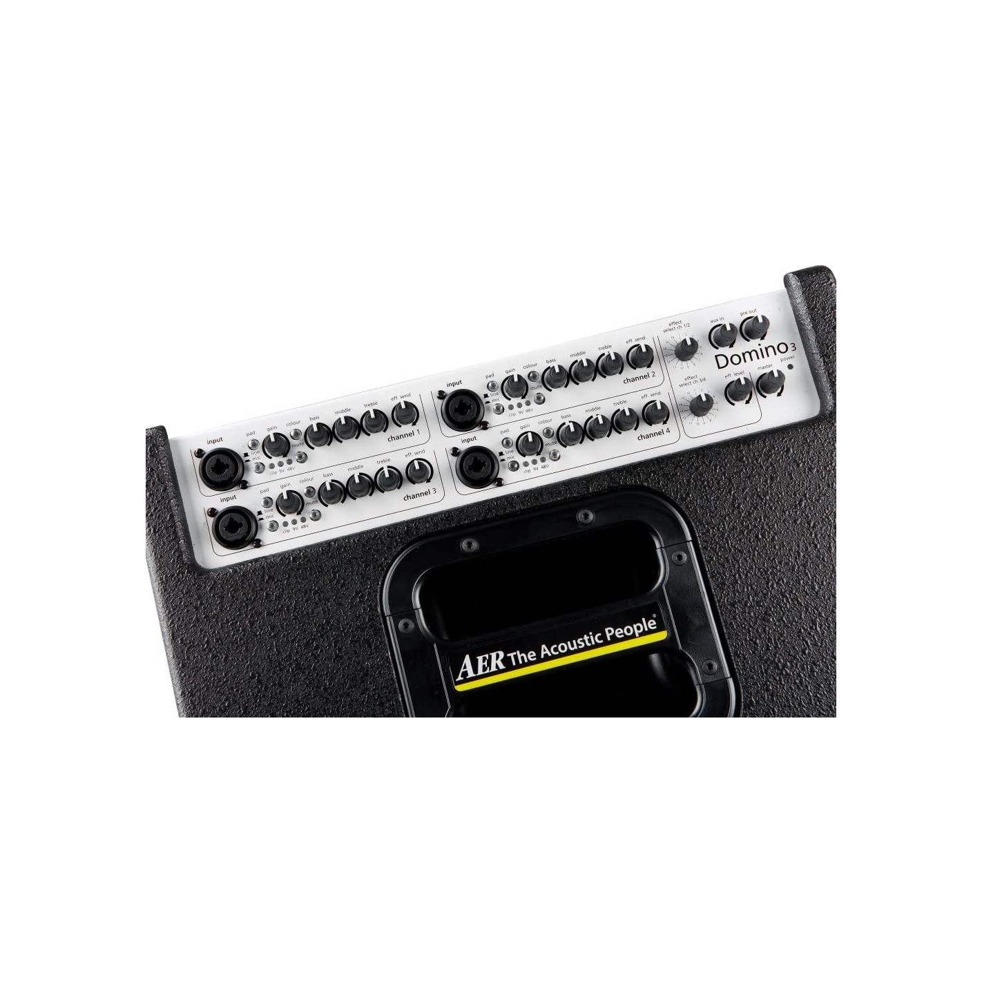 DOMINO-3 4 Canales con entrada combinada XLR / 6.3 mm (1/4 ”) conmutable para instrumentos fuentes de alimentación Phantom o de nivel de línea (por ejemplo micrófonos). Ecualizador: Controles de tono de tres bandas para cada canal. Filtro de color de refuerzo de agudos. Efectos: procesador de efectos digitales con 16 presets. Potencia: 2 x 100 W / 4 ohmios control dinámico. Procesamiento de señales analógicas filtro subsónico baja distorsión. Limitador RMS. Sistema de altavoces: Doble cono de 2 x 8 . Características: Salida de grabación entrada auxiliar return send auriculares salida afinador conmutador de pedal DI-out ajustable silencio de 4 canales. Dimensiones: 365 mm x 420 mm x 300 mm (14 4 x 16 6 x 11 8 ) alto x ancho x profundidad. Peso: 16 00 kg (35 30 libras).