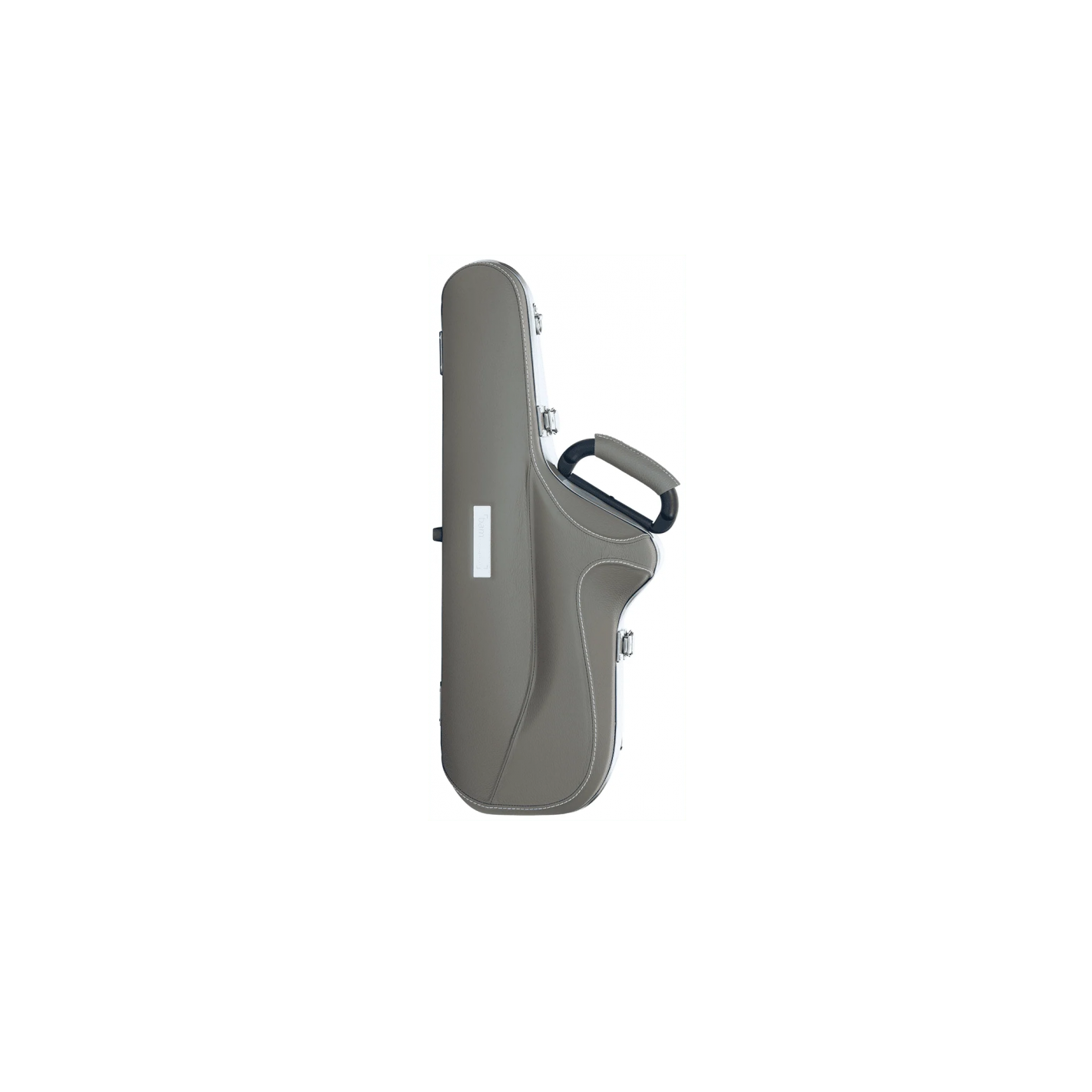 Estuche de saxo alto con tapa superior y base cubiertas con piel natural. Color gris.