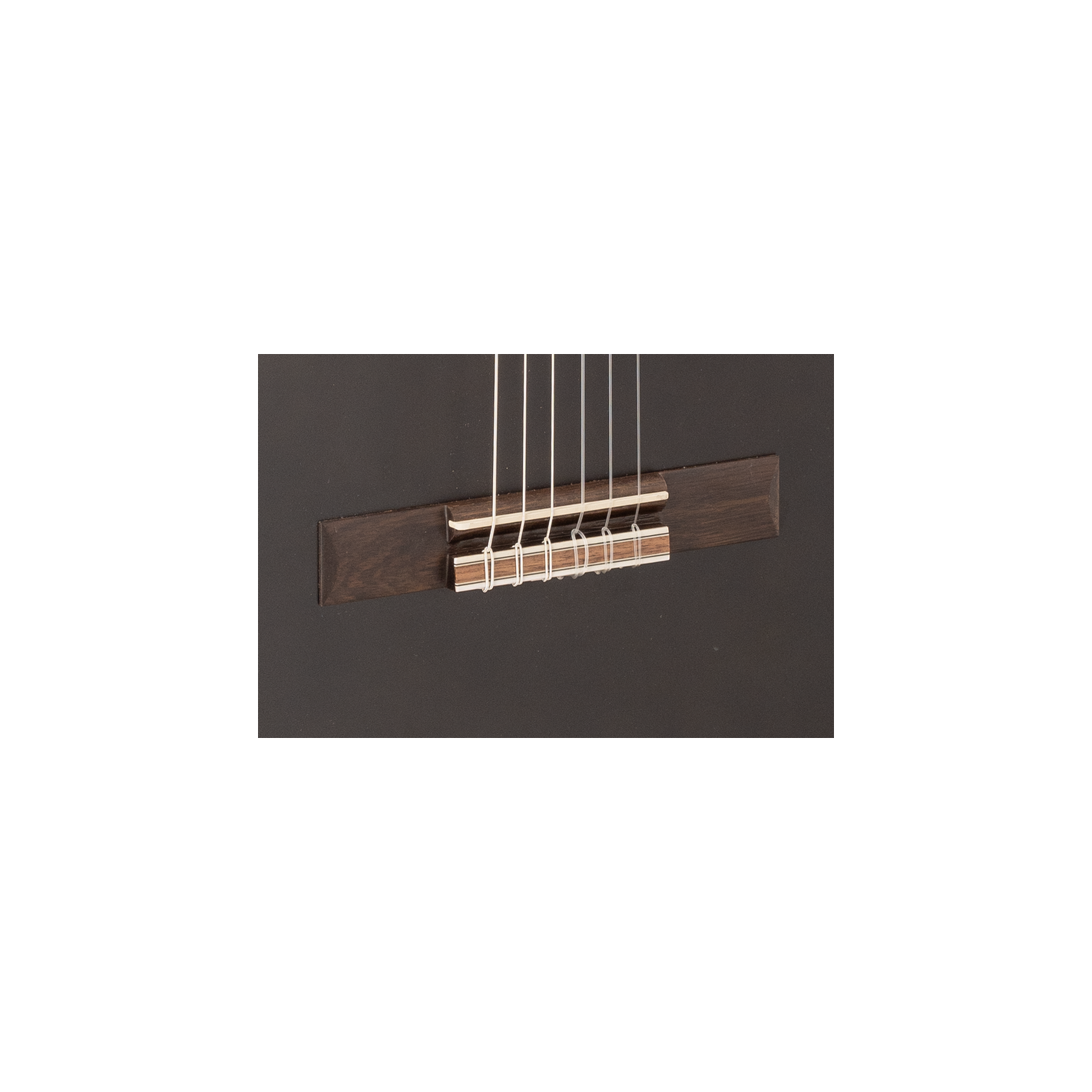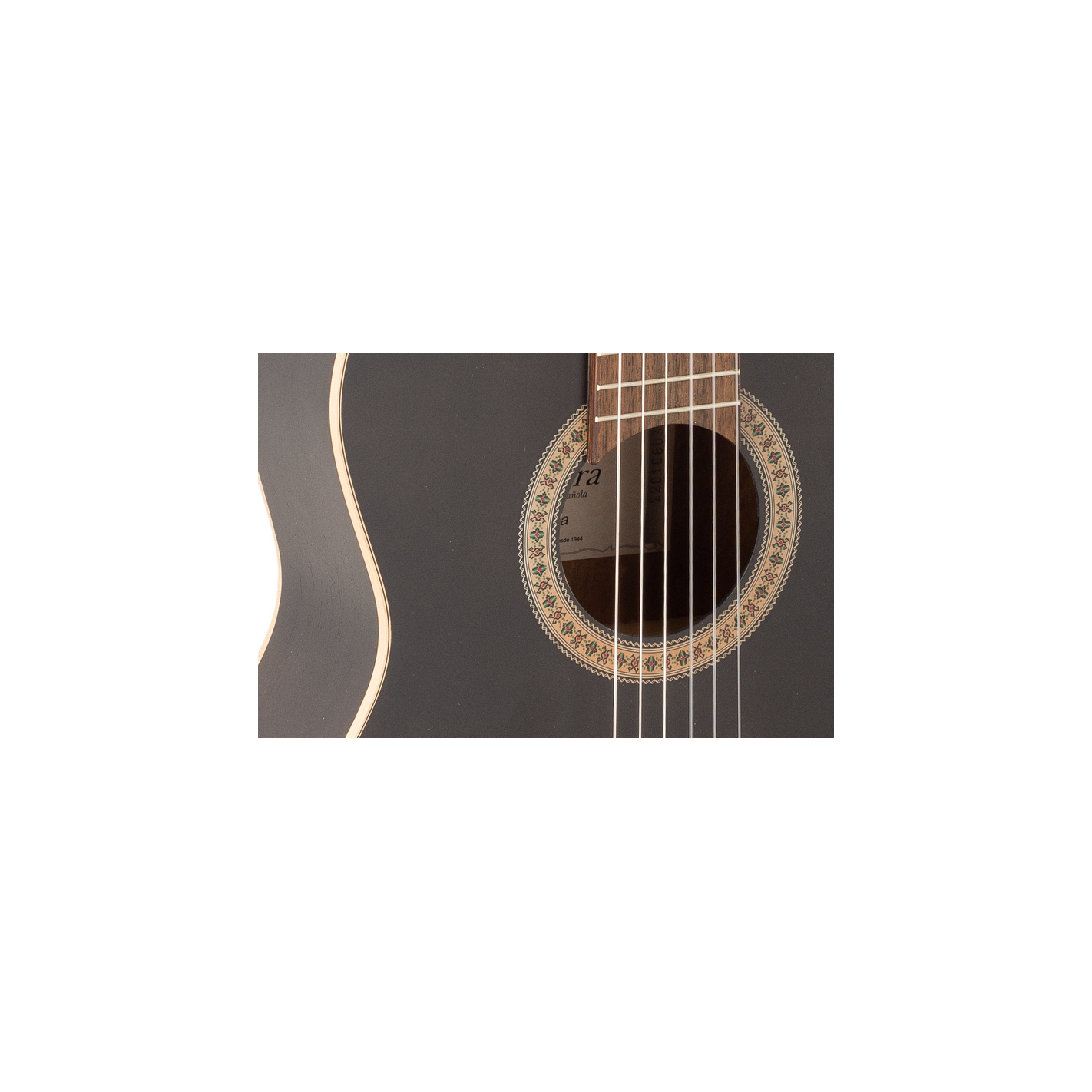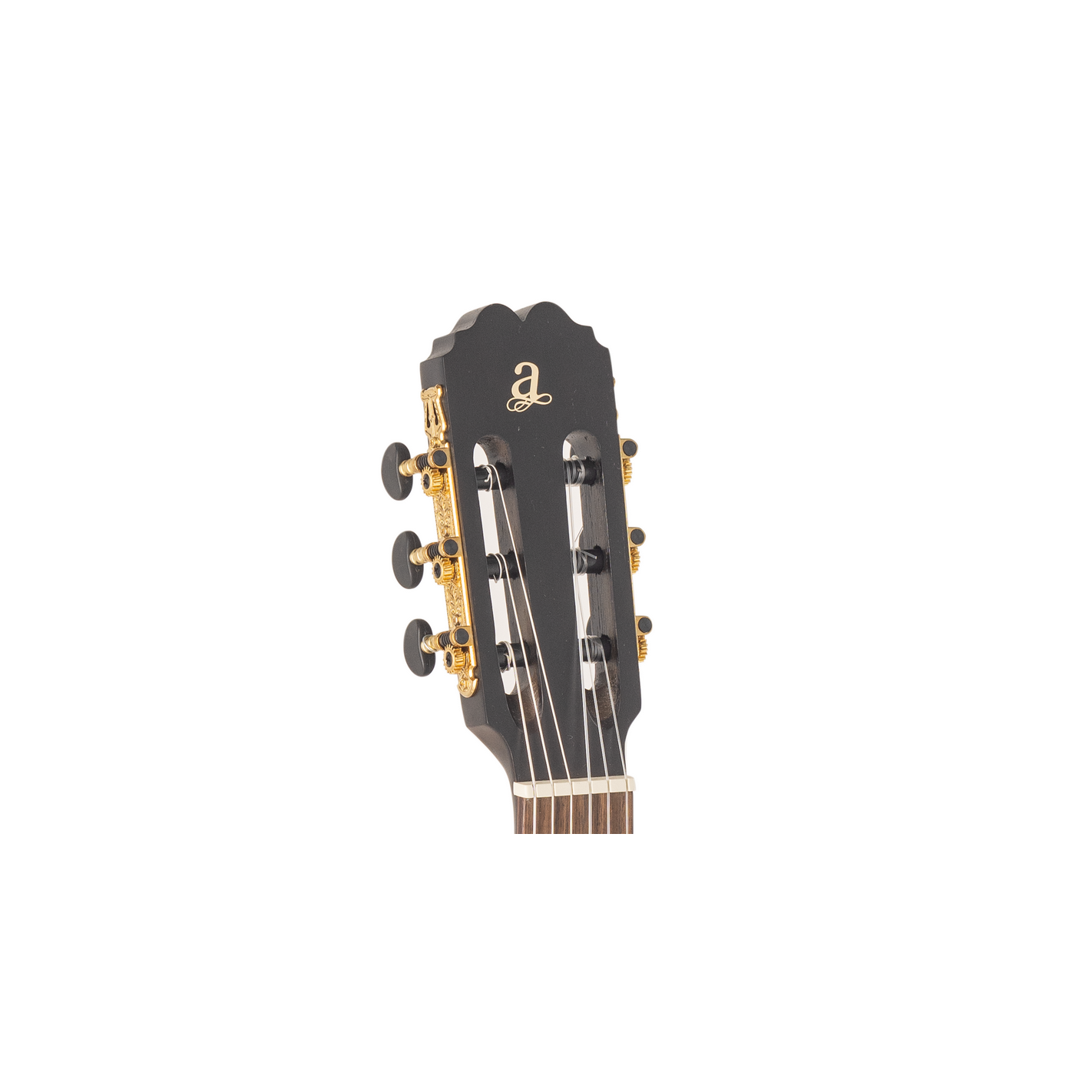 El arce de sus ribetes realza las formas de esta preciosa guitarra con tapa de abeto, aro y fondo de sapelli de color oscuros que junto al clavijero dorado y las palomillas negras hacen que este nuevo modelo de Admira sea muy especial.