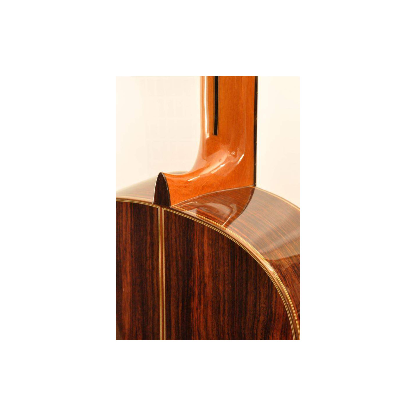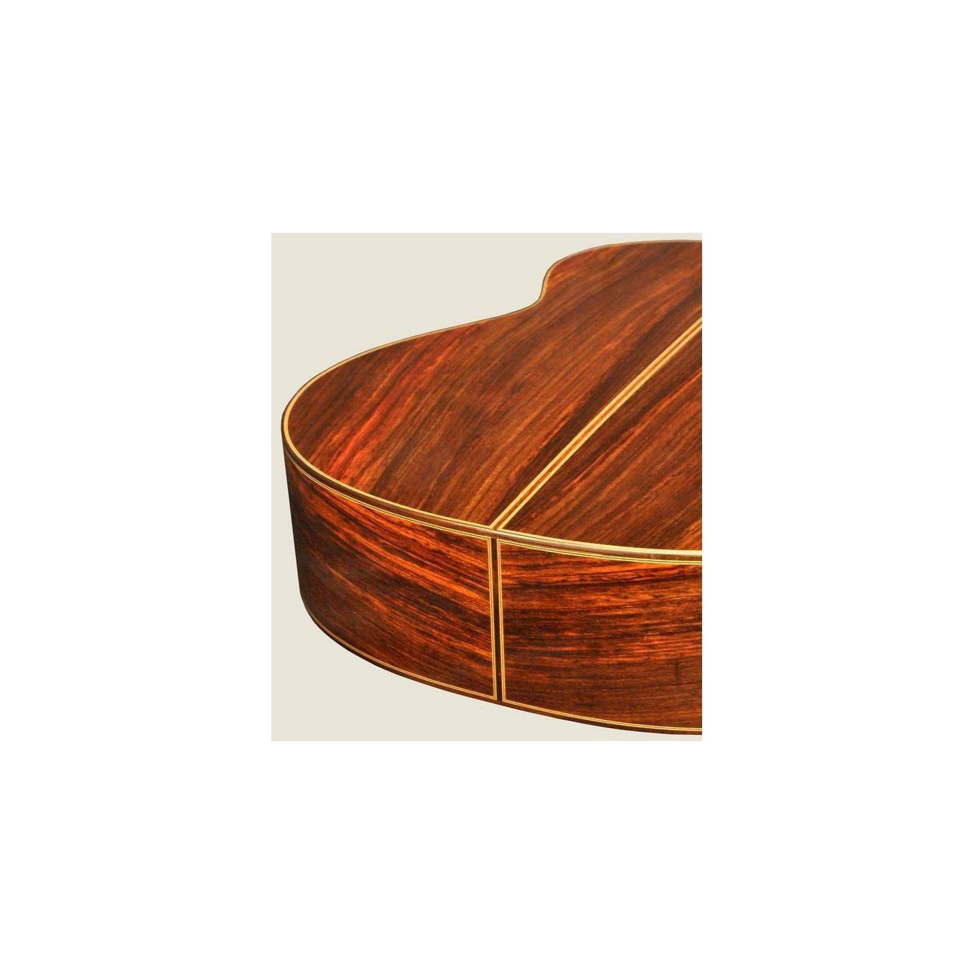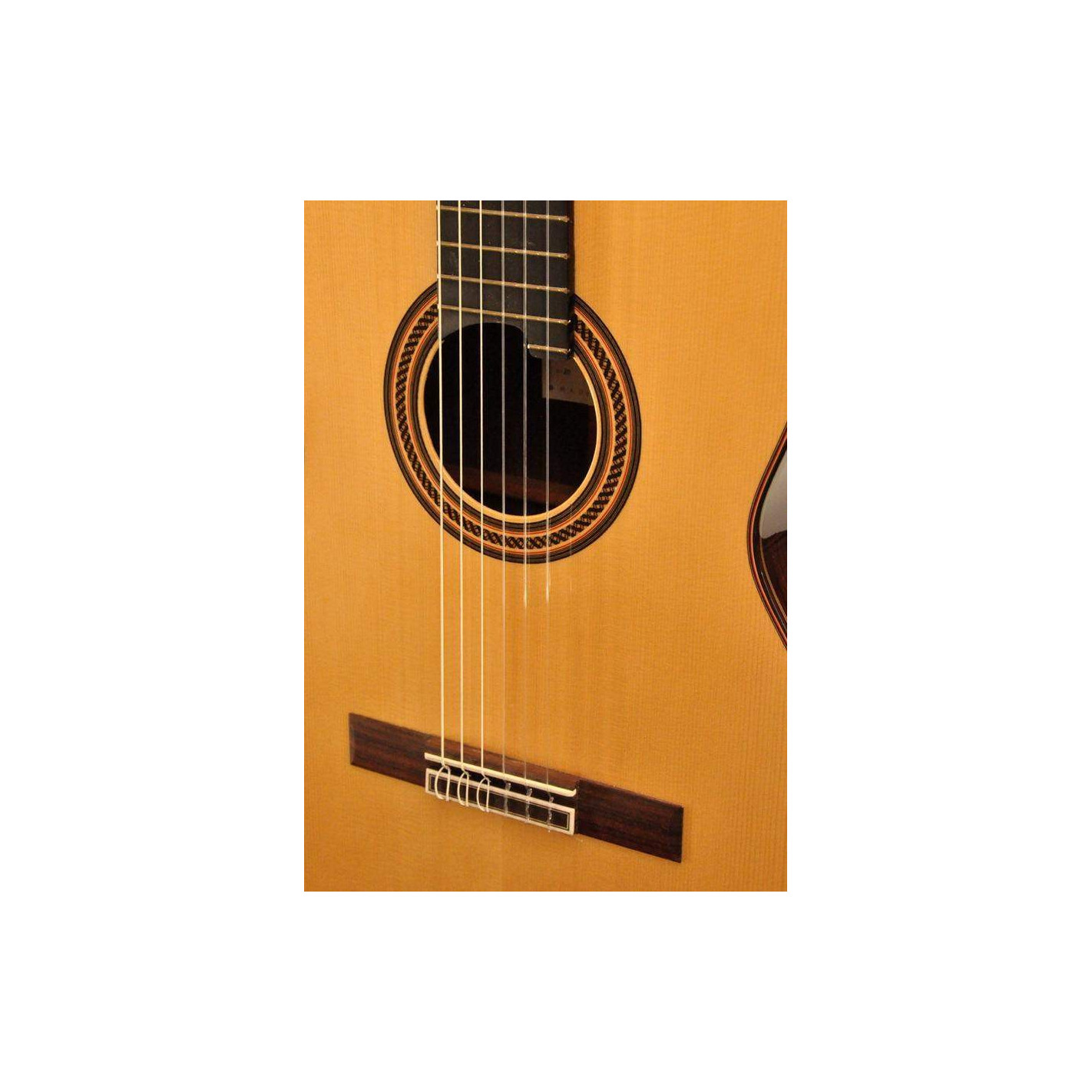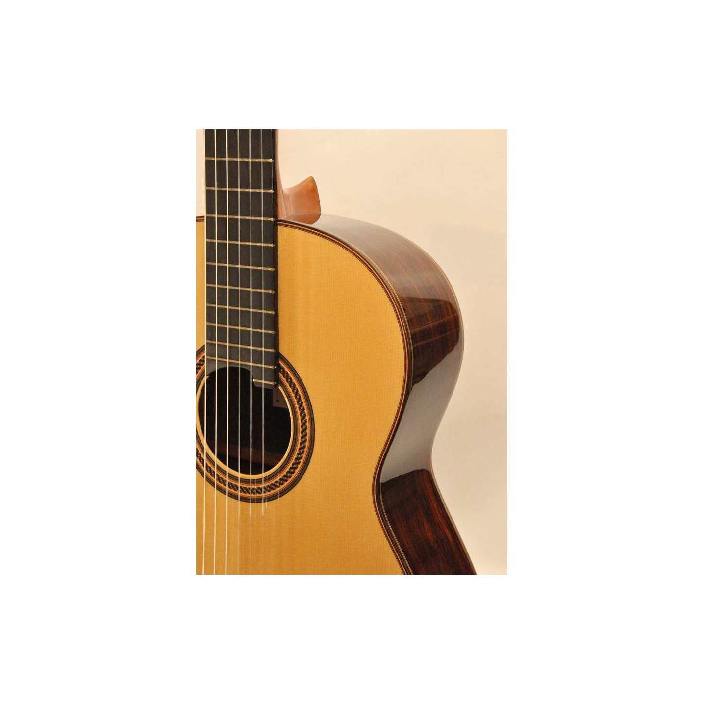 Guitarra de concierto muy atractiva. Se ha prestado mucha atención a los detalles, como la roseta perfectamente elaborada o los múltiples filetes en la tapa y el fondo, todos combinados con acierto.