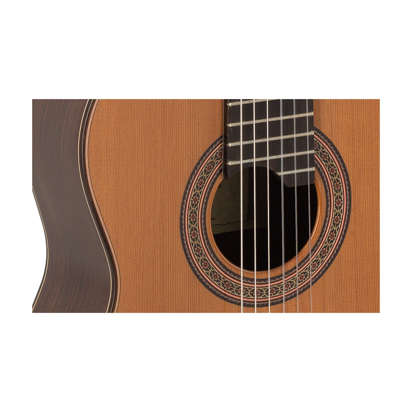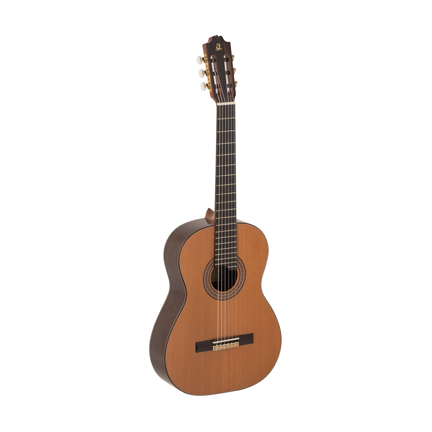 La A50 está fabricada con una selección de maderas, combinando el cedro macizo en la tapa y el palo santo también macizo en los aros y fondo. Su trabajo artesanal, junto a los detalles en los ribetes y marquetería hacen de esta guitarra la Reina de todas las guitarras Admira. Tiene el brazo de tres piezas con refuerzo de Palisandro lo que le confiere mayor estabilidad a la guitarra y un sonido claro y nítido.
