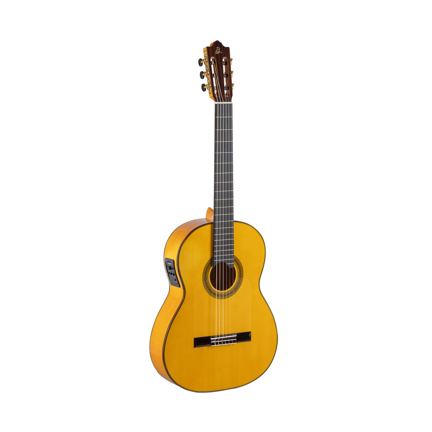 ADMBULEF admira Bulería serie Flamenco fishman Tapa: Abeto Macizo. Aros y fondo: Ciprés con ribetes de madera. Brazo: Cedro con refuerzo de Ébano. Diapasón: Ebano con 20 trastes. Clavijero Der Jung: Dorado lira con palometa negra Ratio 1:14. Puente: Palisandro de 12 agujeros. Cejuela: Hueso. Acabado: Alto Brillo. Cuerdas: Savarez 500CJ. EQ: Fishman Classica III. Golpeador: Colocado. Nº Trastes: 20. Las imágenes publicadas pueden diferir ligeramente del producto final.
