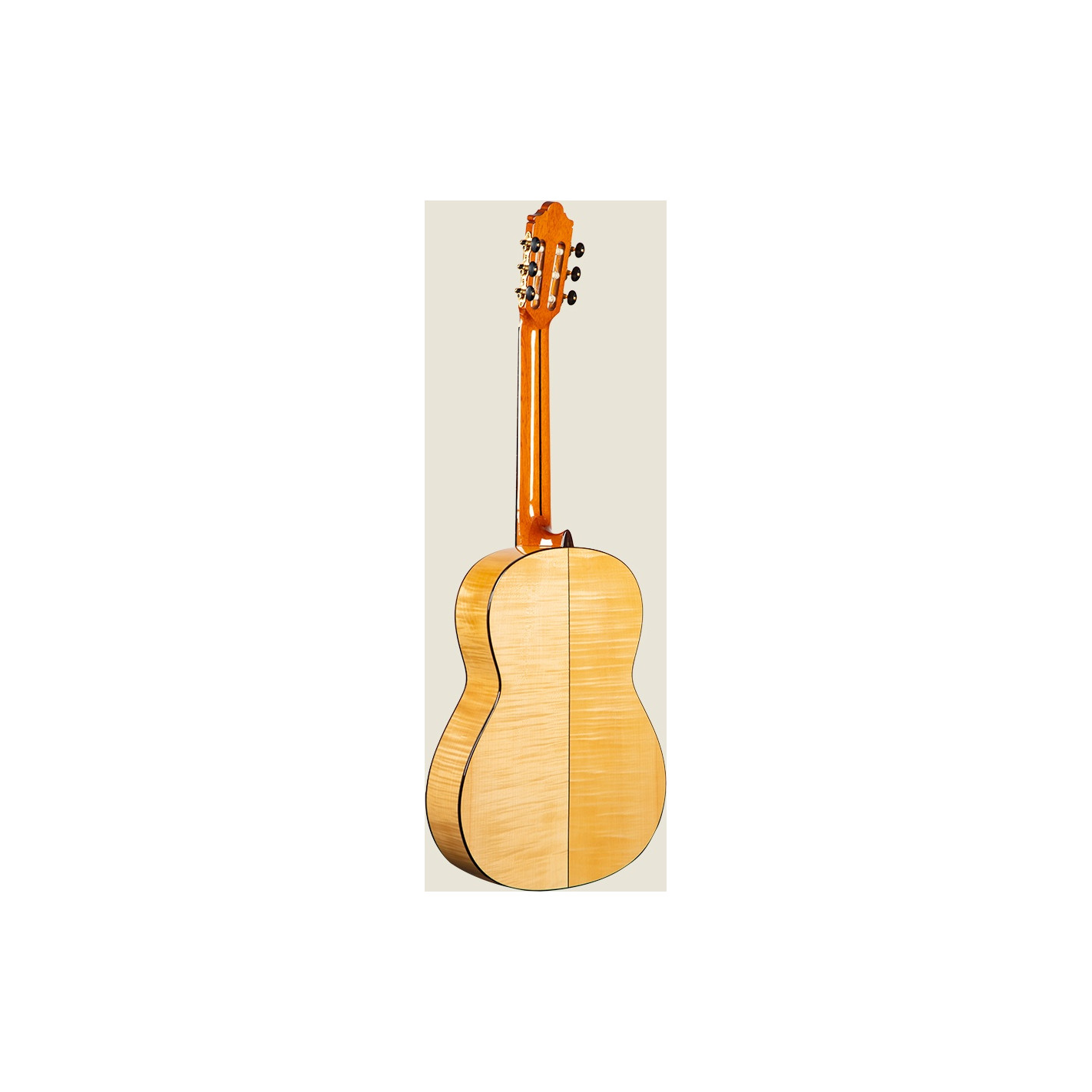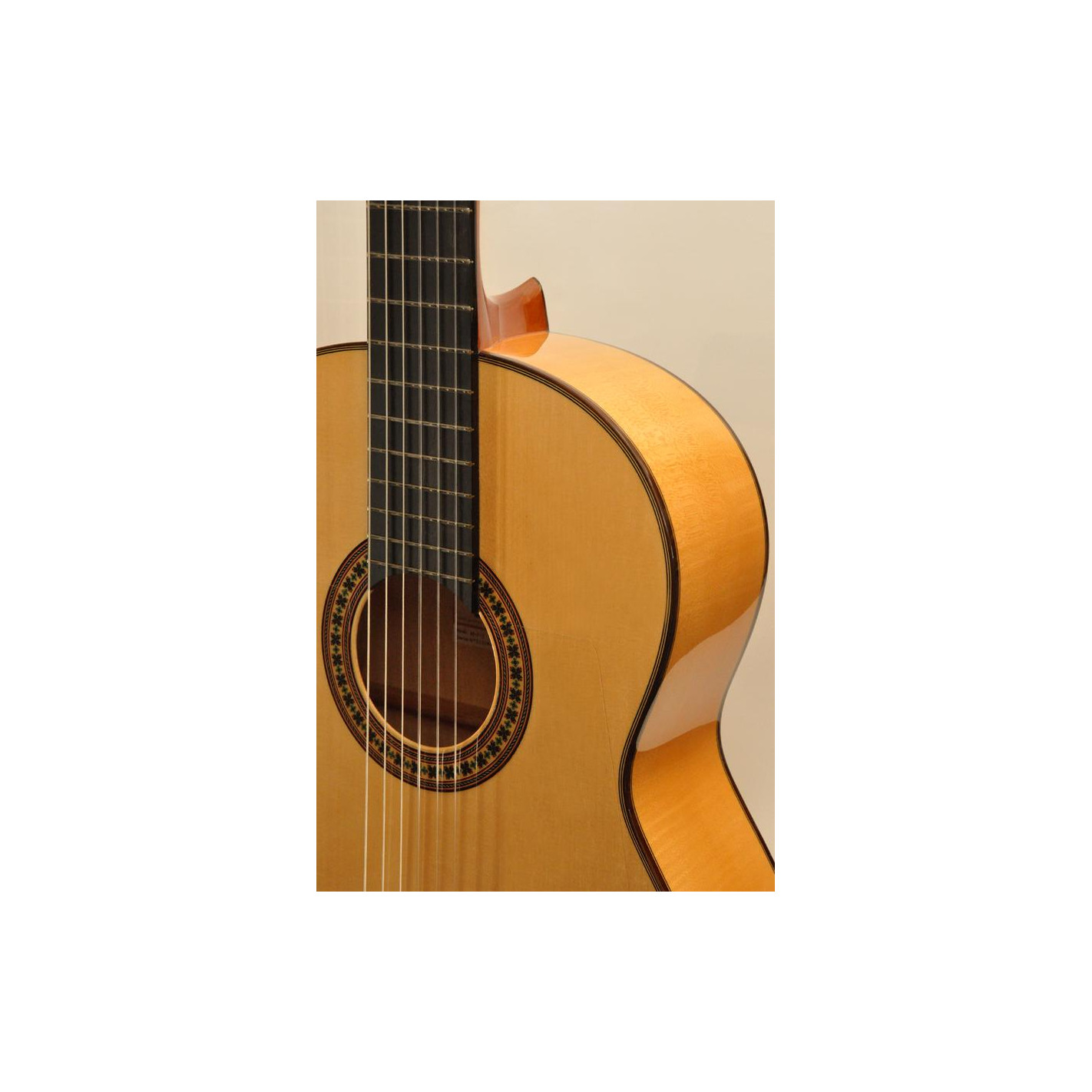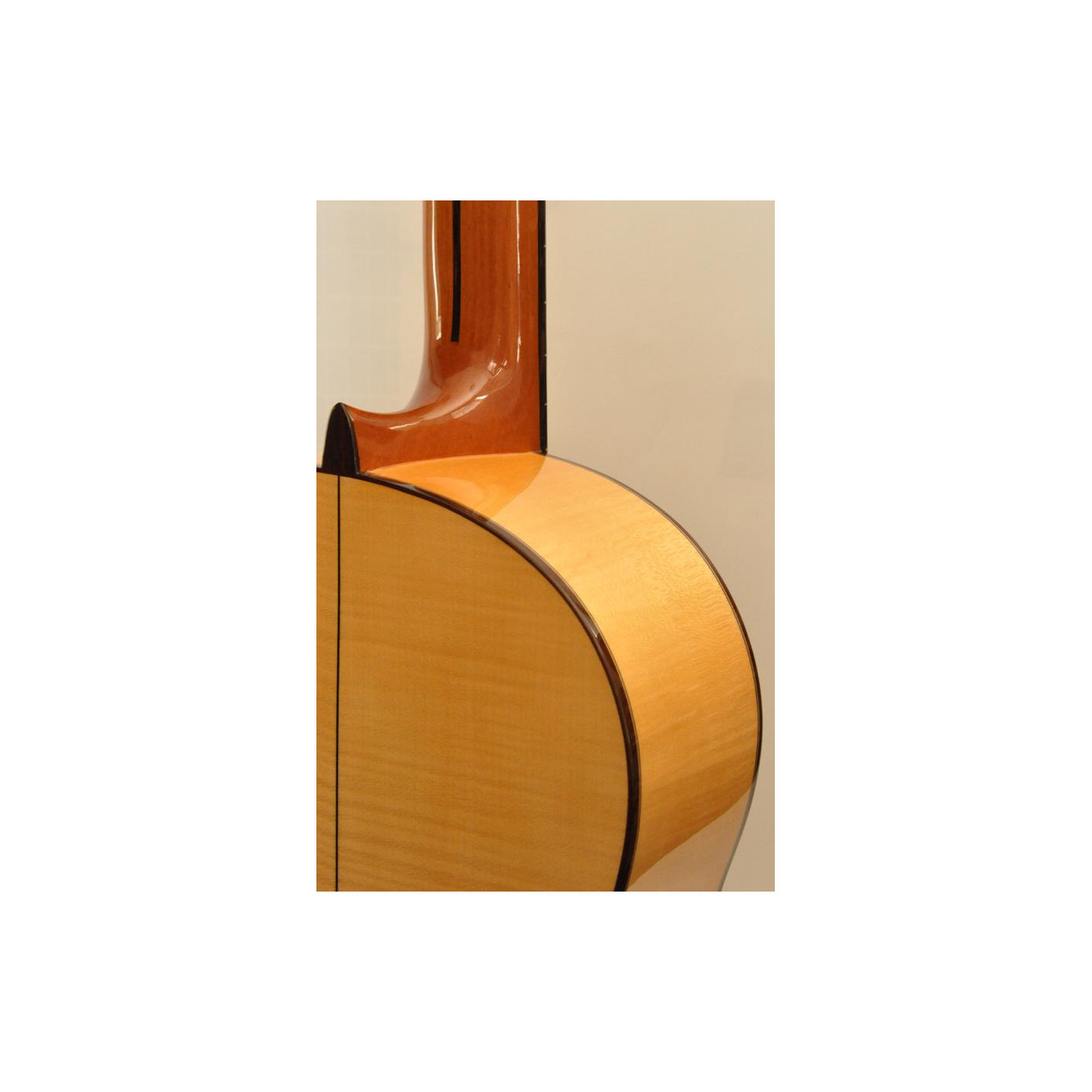 Guitarra de flamenco con carisma gracias a la belleza del arce rizado del fondo y los aros. Los acabados son delicados y las maderas de alta calidad.