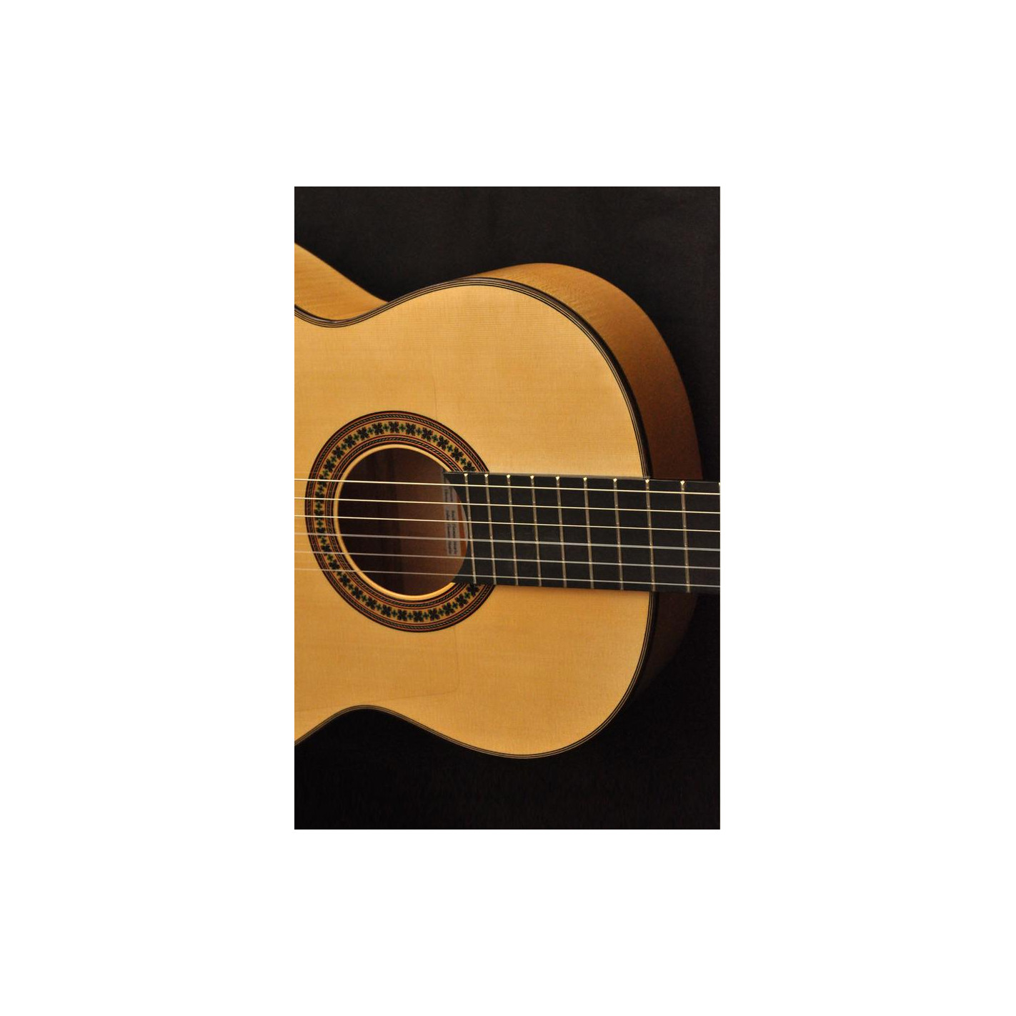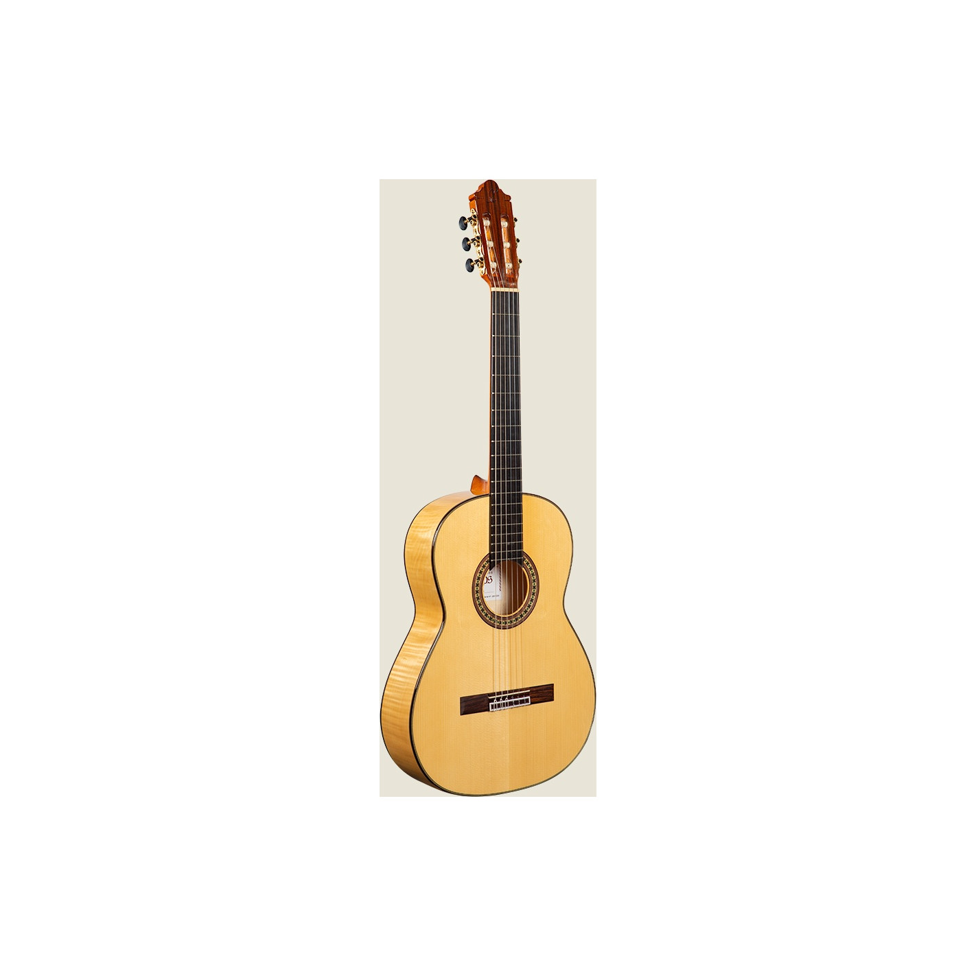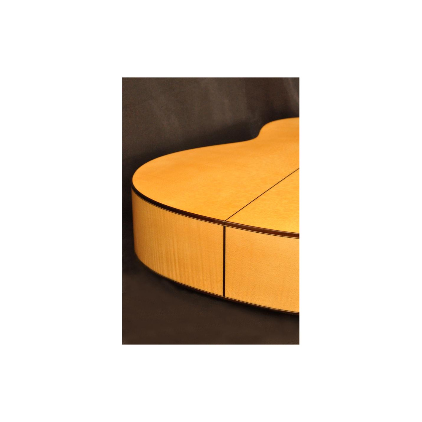 Guitarra de flamenco con carisma gracias a la belleza del arce rizado del fondo y los aros. Los acabados son delicados y las maderas de alta calidad.