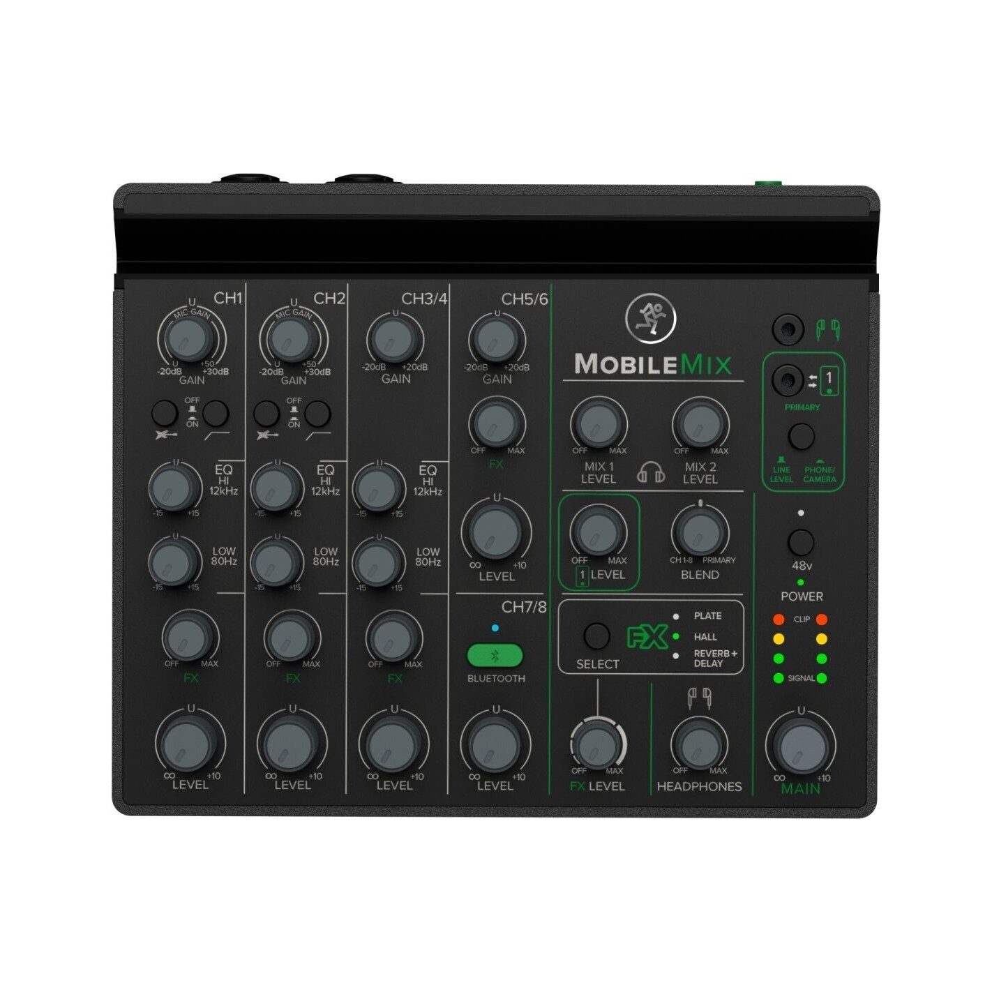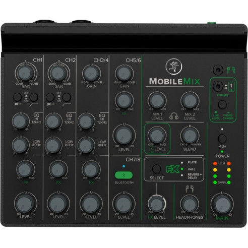 MobileMix reúne la legendaria calidad de fabricación y el excelente sonido que hacen que Mackie goce de la confianza de todo el mundo. Comienza con dos canales de previo de micro totalmente equipados con conectores combo XLR y de 1/4', conmutadores de impedancia Hi-Z para guitarras eléctricas y otros instrumentos pasivos, filtros de corte de graves y alimentación phantom de 48 V para micros de condensador.