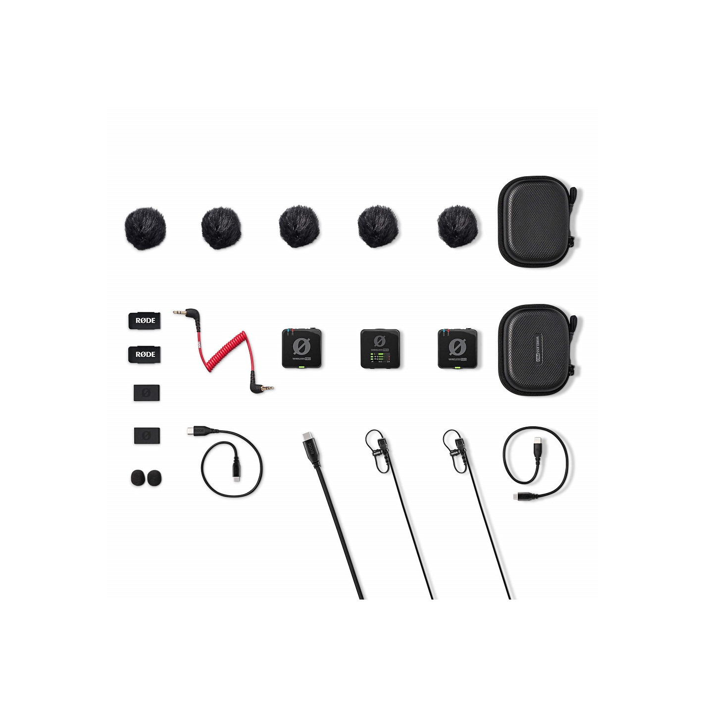 - Incluye 2 transmisores, 1 receptor, 1 estuche de carga (PRO), 3 antivientos, 2 MagClip GO, 2 Lavalier II con accesorios, 1 estuche para accesorios, 1 gamuza para lentes, 1 cable SC2 TRS-TRS, 1 cable SC21 USB-C-Lightning, 1 cable SC22 USB-C-USB-C, 1 cable SC34 SuperSpeed USB-C-USB-C