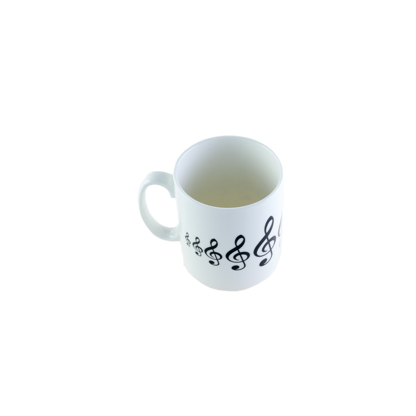 Taza de cerámica blanca decorada a mano con dibujo de claves de sol. Apta para lavavajillas y microondas.