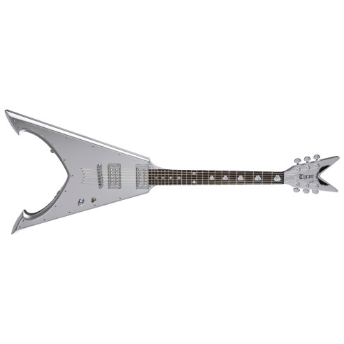 Dean no se detiene. Esta es la versión profesional de la Chrome Tyrant de Michael Amott que no te arruinará. El acabado plateado metálico con un golpeador cromado exige respeto para cualquiera que toque con esta bestia. Equipada con una pastilla de puente USA DMT Tyrant y una USA DMT Time Capsule en el mástil, esta guitarra trae todos los tonos que uno necesita para el metal de alta ganancia con cremosos leads y tonos limpios suaves. Diapasón de ébano con incrustaciones personalizadas de perlas Valknut que no dejan piedra sin remover.