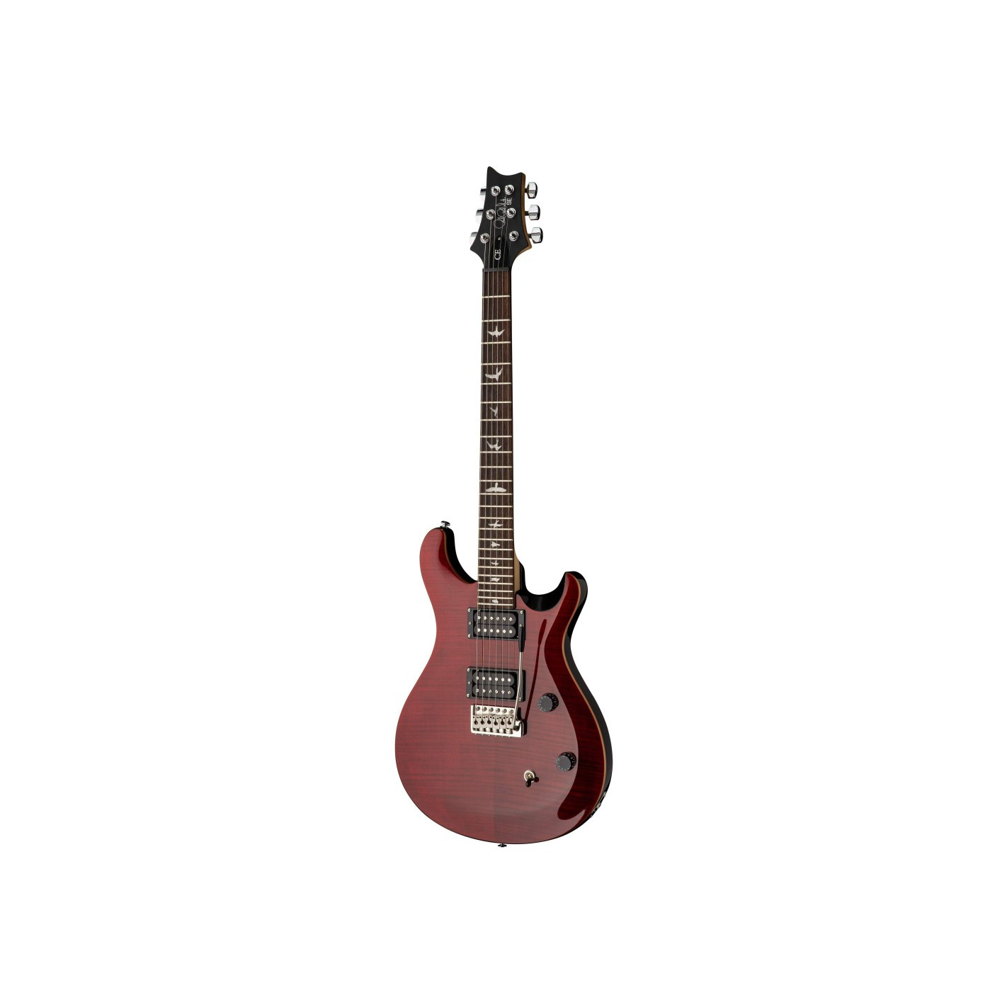 GUITARRA ELÉCTRICA DOUBLE CUT PRS SE CE24, BU - Black Cherry, Flame Maple Veneer, Maple Top, Mahogany Body (Shallow Violin Carve), Wide Thin, 24 fret Maple neck, 25'' Scale Length, 10'' Radius, Rosewood Fingerboard, Bird Inlays, PRS Nut, 85/15 ''S'' Pickups, New sloped pickup rings, Volume and Push/Pull Tone Control w/ 3-Way Toggle Pickup Switch PRS Patented Tremolo, PRS Designed Tuners with Wing buttons, Nickel Hardware, High Gloss Polyurethane finish, PRS SE Gigbag