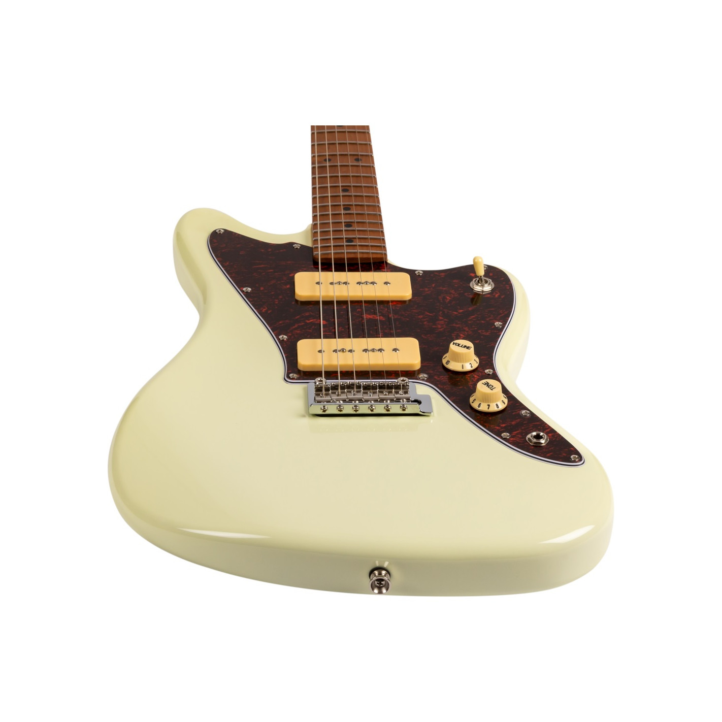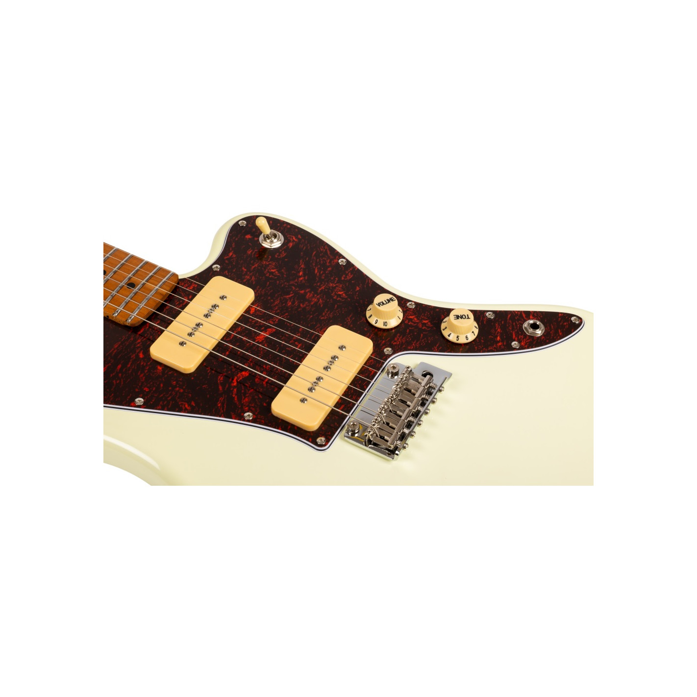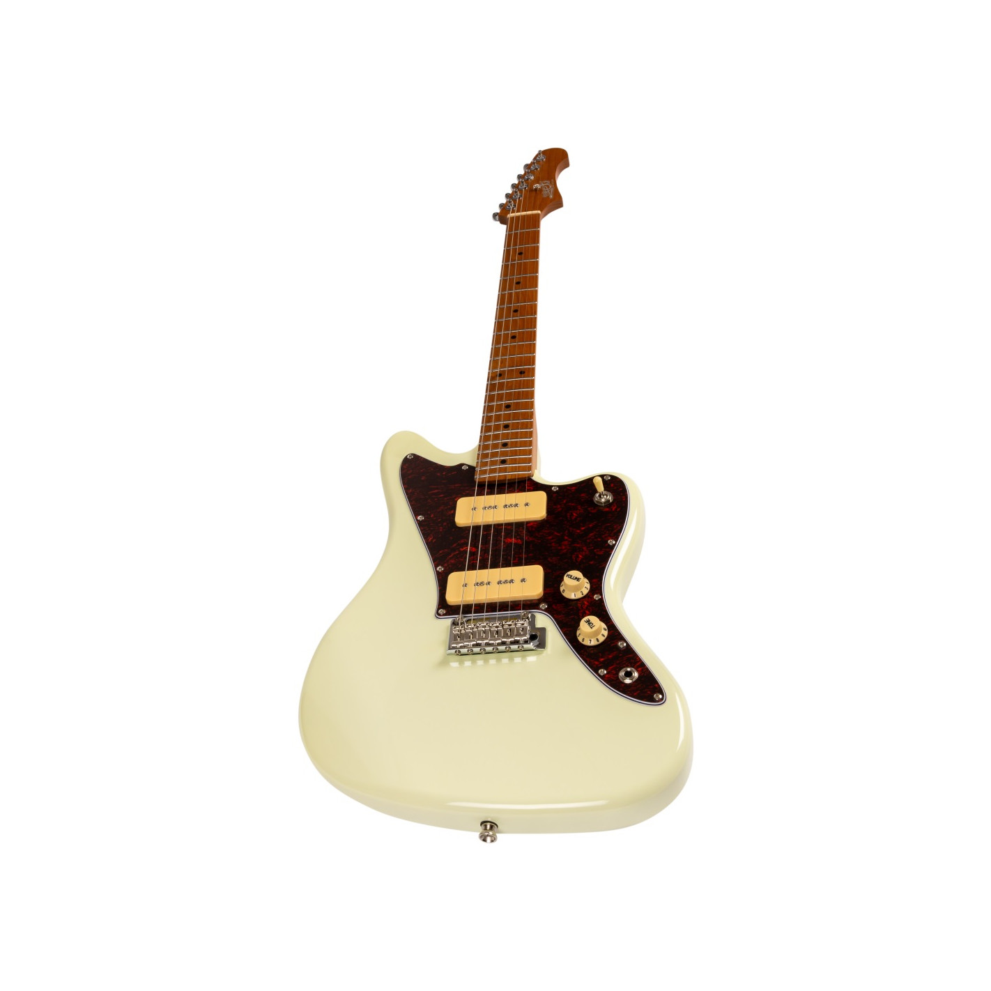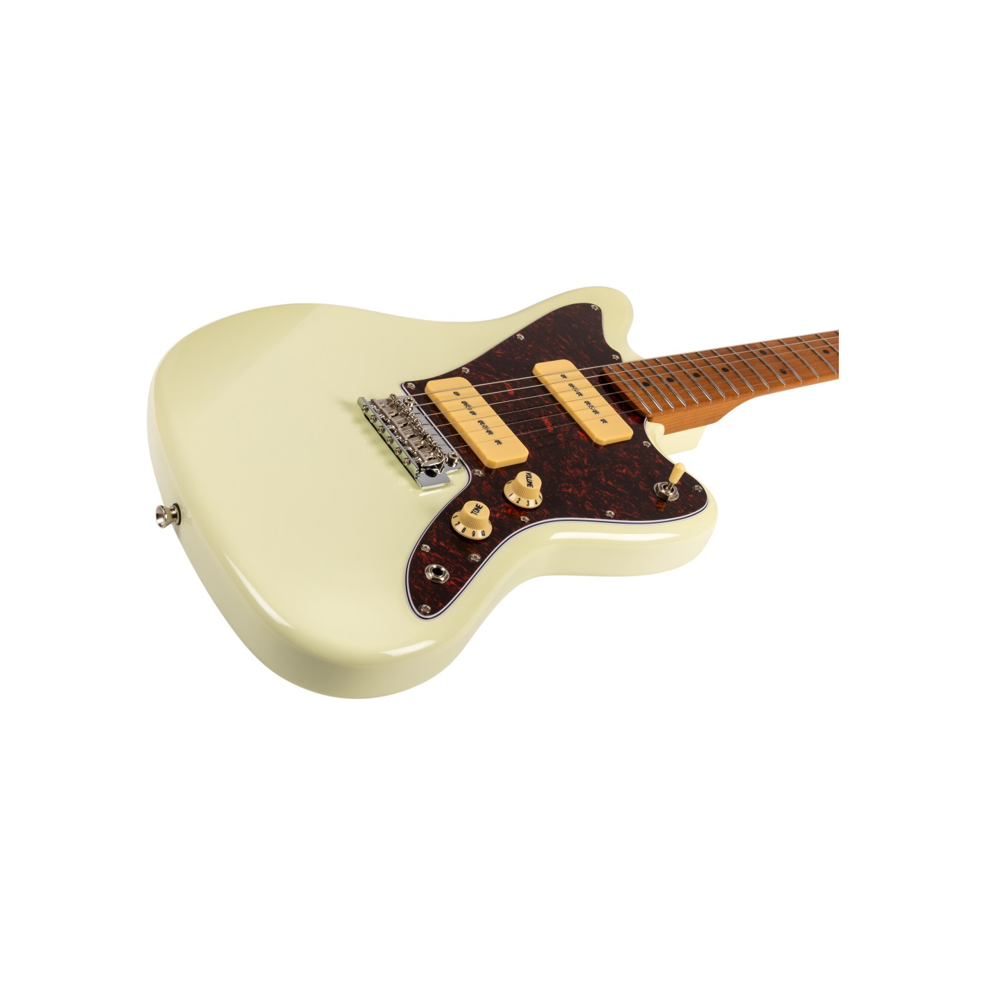 La guitarra eléctrica Jet JJ300-P90-OW White combina una estética offset clásica con una construcción moderna y componentes cuidadosamente seleccionados. Su cuerpo de álamo tostado con acabado blanco se complementa con un mástil de arce canadiense tostado en perfil Modern C, que proporciona una sensación cómoda y una excelente estabilidad. El diapasón de arce tostado con radio de 9,5" y 22 trastes medium jumbo ofrece una ejecución ágil y precisa, ideal para guitarristas que valoran la expresividad.