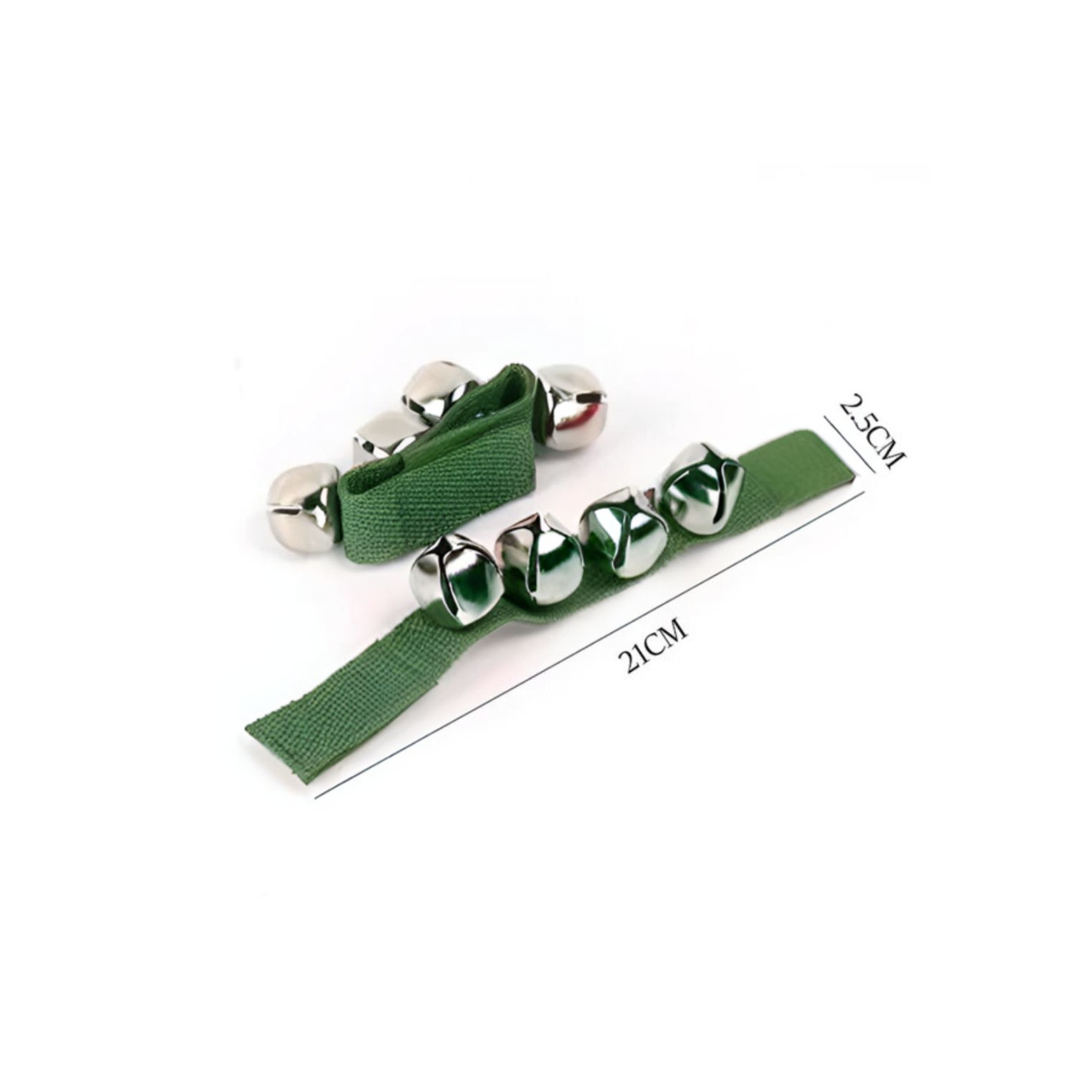 Muñequera/Tobillera con cascabeles Goldon modelo 33404 con 4 cascabeles, correa de nylon color verde de 23 cm con sujeción de velcro.