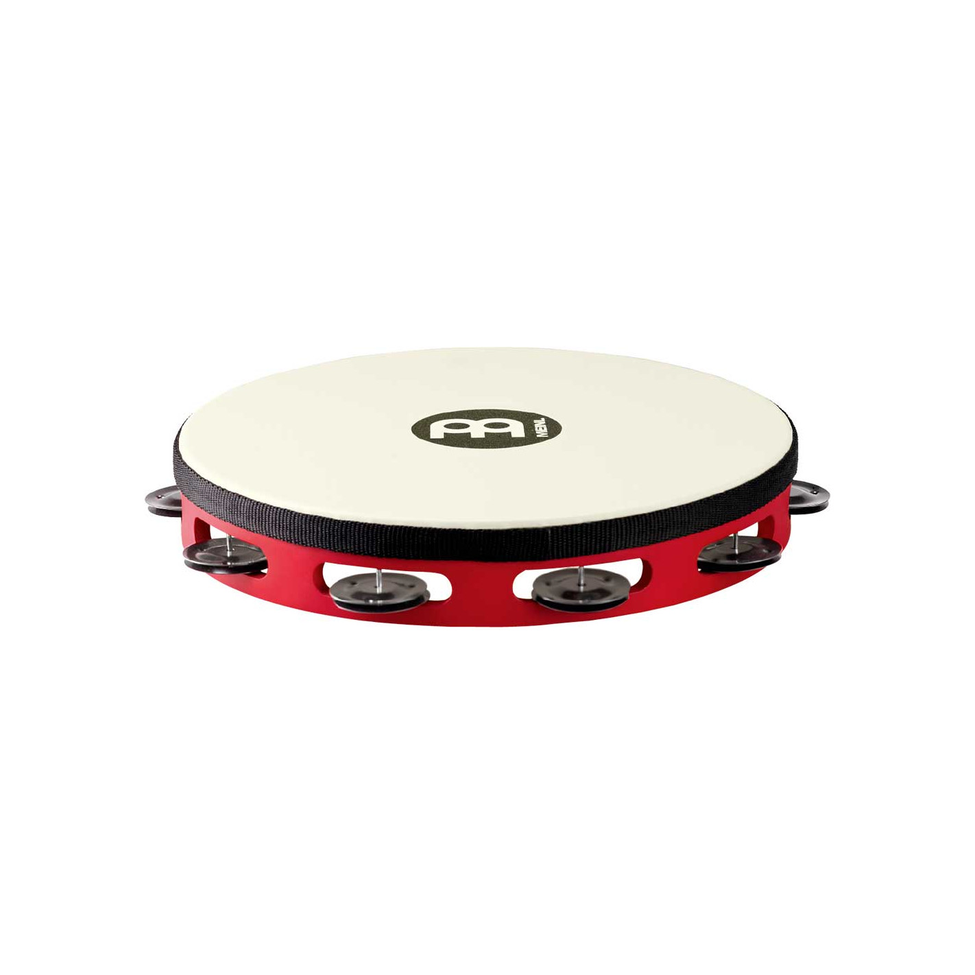 PANDERETA CON PARCHE Pandereta con parche de 1 fila de sonajas de acero en negro, cuerpo rojo. La pandereta para llevar a todos