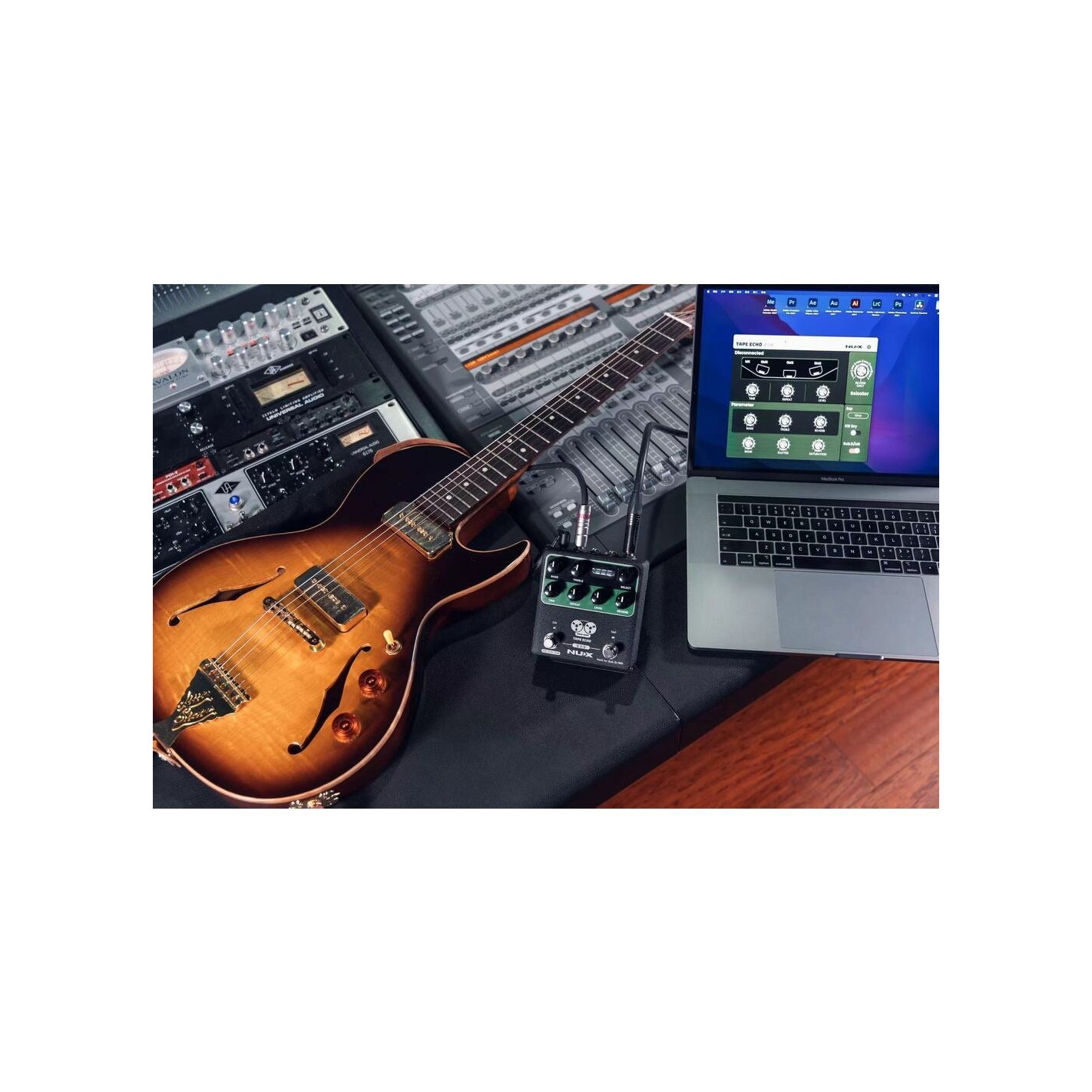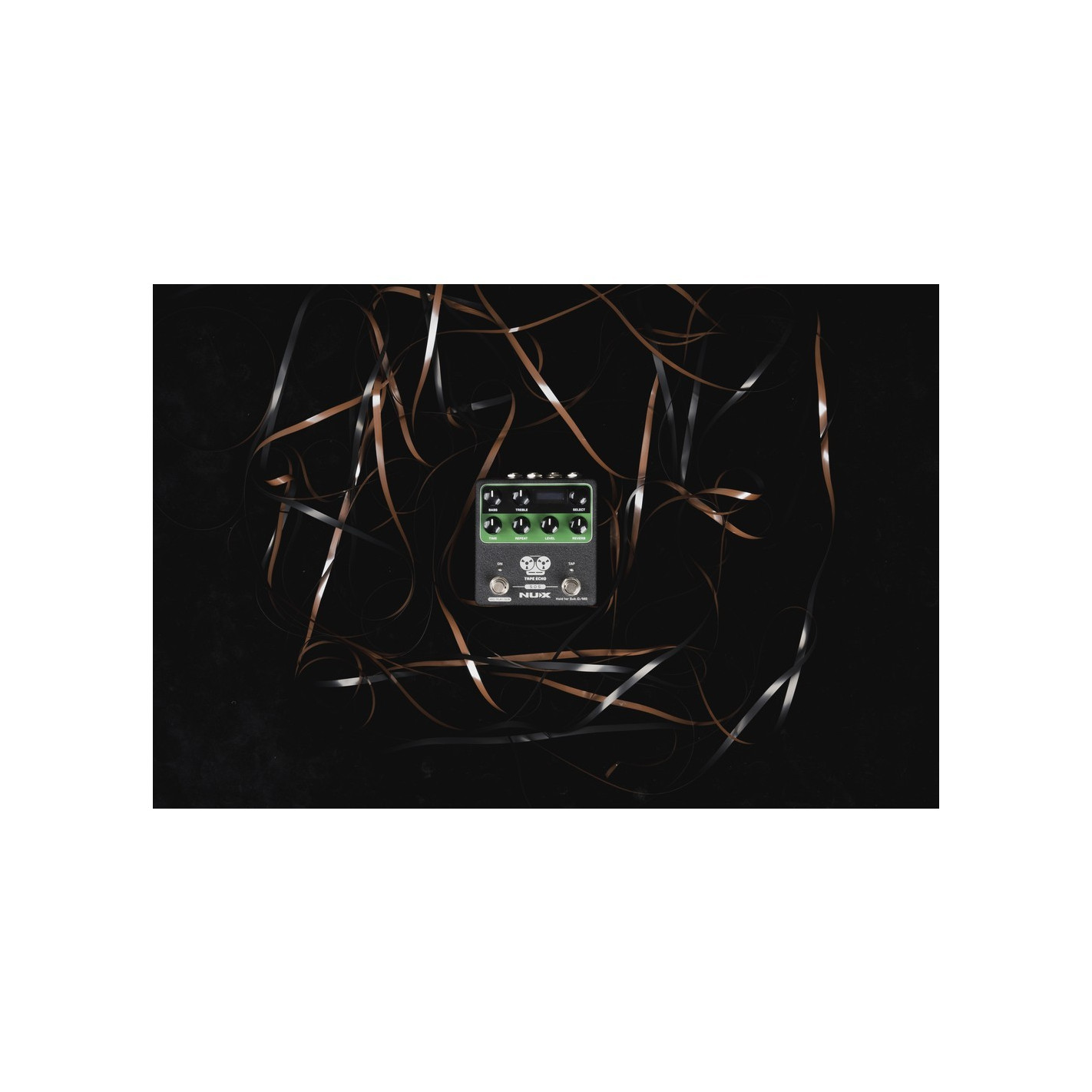Pedal de efectos Tape Echo + Looper NUX Tape Echo NDD-7 - Tiempo de retardo estéreo de hasta 1600 ms por Tap Tempo. 7 combinaciones de cabezales Repro-Tape y reverberación solamente. La tecnología Core-Image brinda un Tape Echo natural con un sonido de reverberación de resorte paralelo. Retroalimentación de cambio de tono infinito realista con ajustes de perillas TIME & REPEAT. Firma de tiempo de subdivisión con interruptor de pie Tap Tempo. Bucle de frase estéreo de 40 segundos con pantalla de estado OLED. Entrada/salida MIDI.