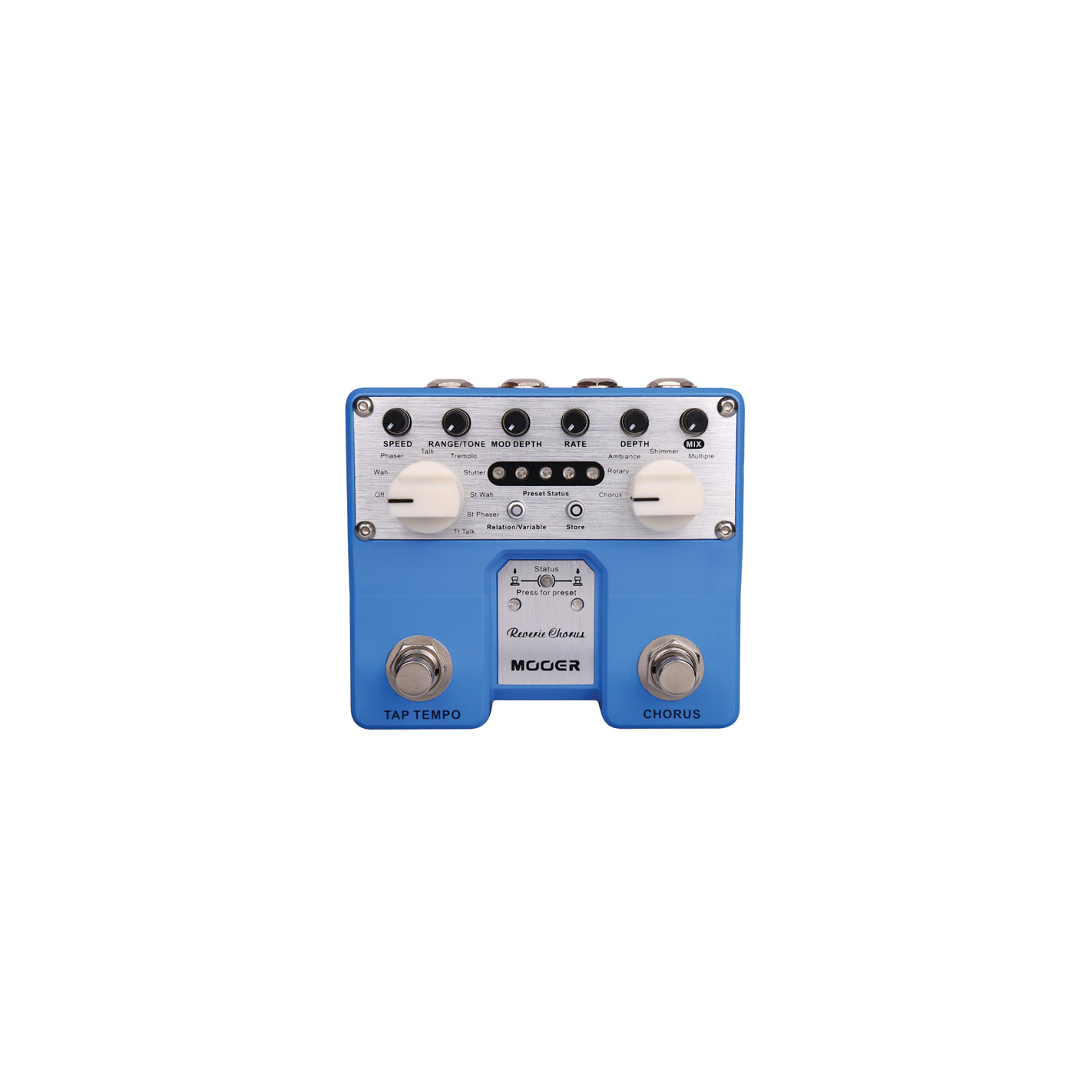 PEDAL DE REVERB Tiene 5 efectos diferentes de chorus: Chorus Standard, Rotary, Ambience, Shimmer y Multiple. Cada uno de ellos se puede modificar con las siguientes modulaciones: Wah, Phaser, Talk, Tremolo, Stutter, St. Wah, St. Phaser y Tr. Talk.Función paramétrica de almacenaje, guarda hasta 5 presets. Con entradas y salidas para 2 canales stereo. Función Tap Tempo para cambiar facilmente la velocidad del efecto. True Bypass.