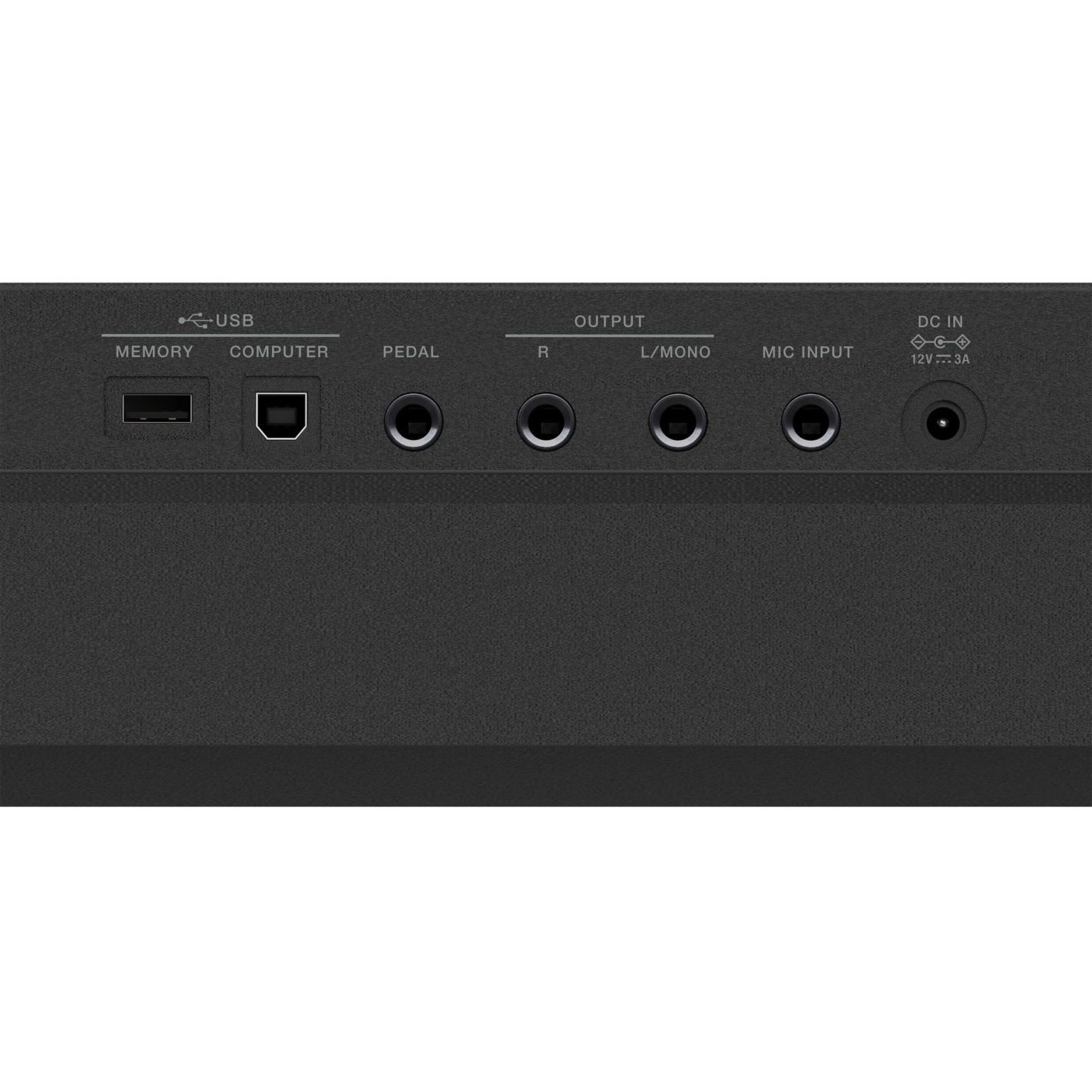 - Conexiones: Salida para auriculares, salida (L/Mono, R) jack, entrada para micro jack, entrada para pedal jack, puerto USB para ordenador tipo B y puerto para memoria USB tipo A