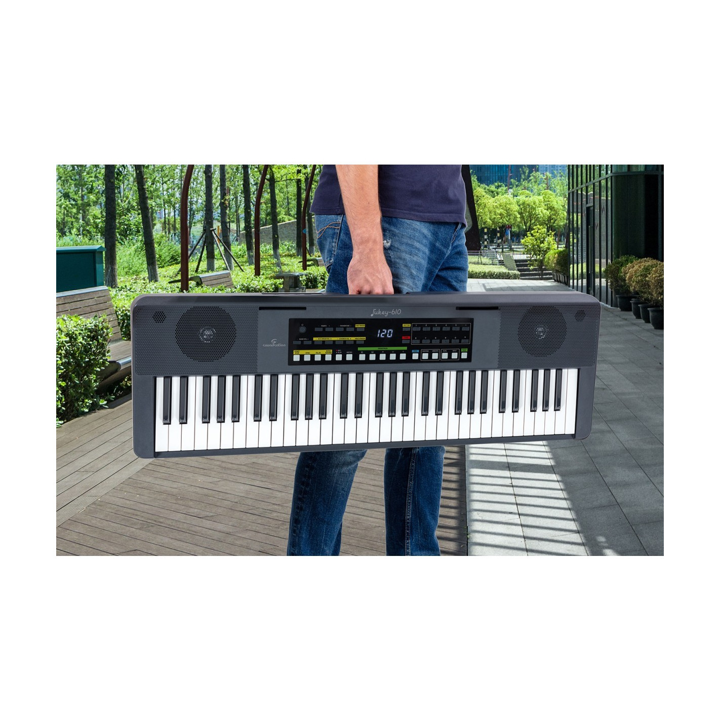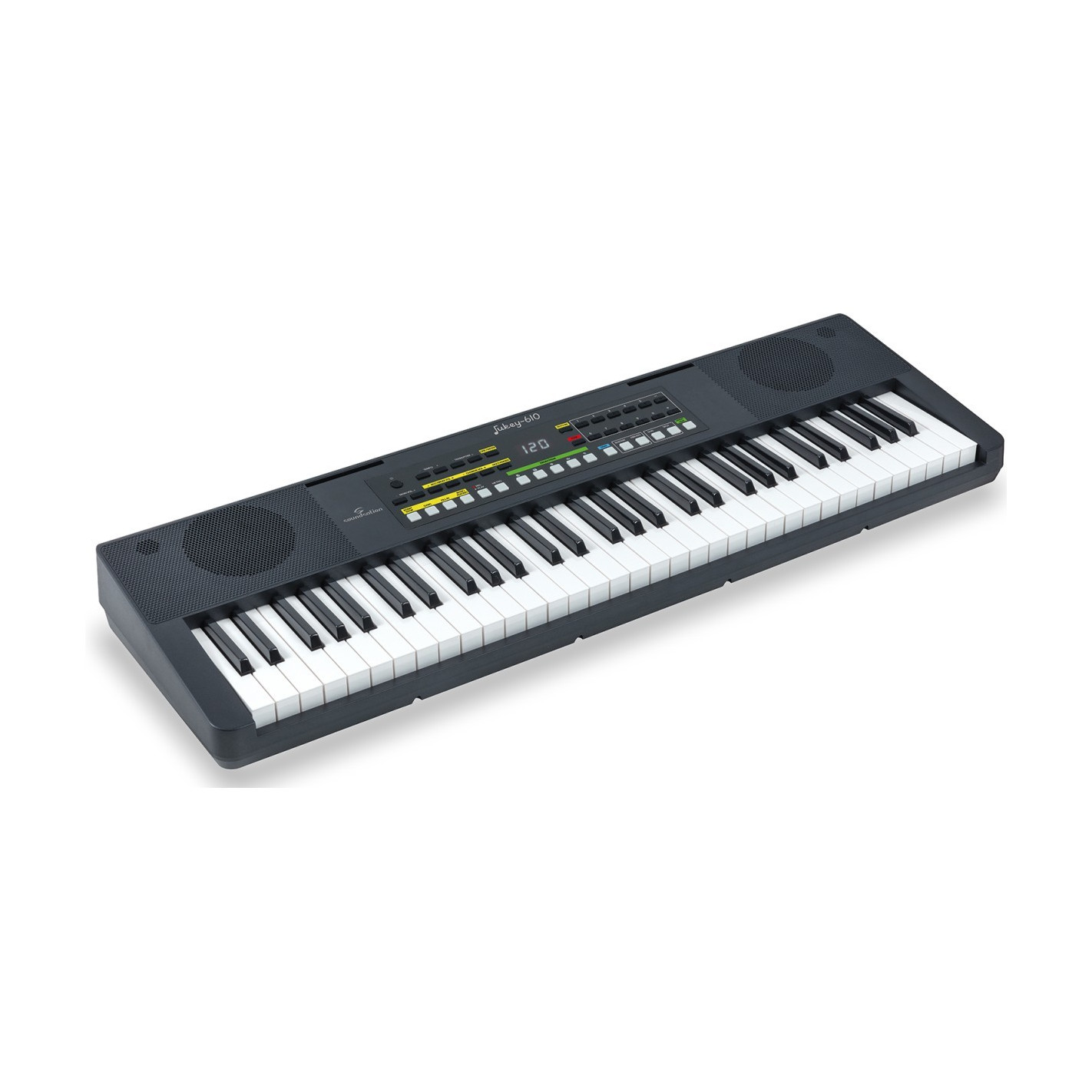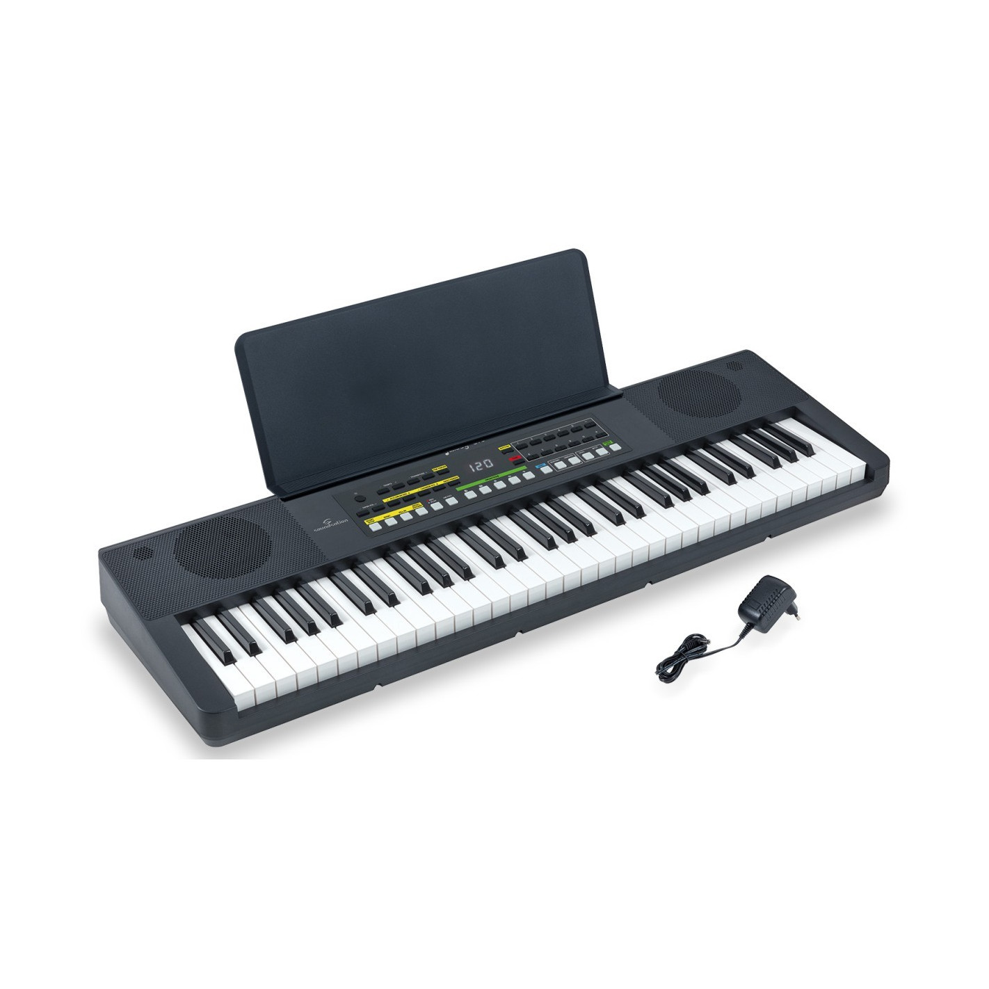 Funciones principales: Sustain, Vibrato, Transposición, Tempo, Metrónomo, Batería manual, Pads de batería REC/PLAY