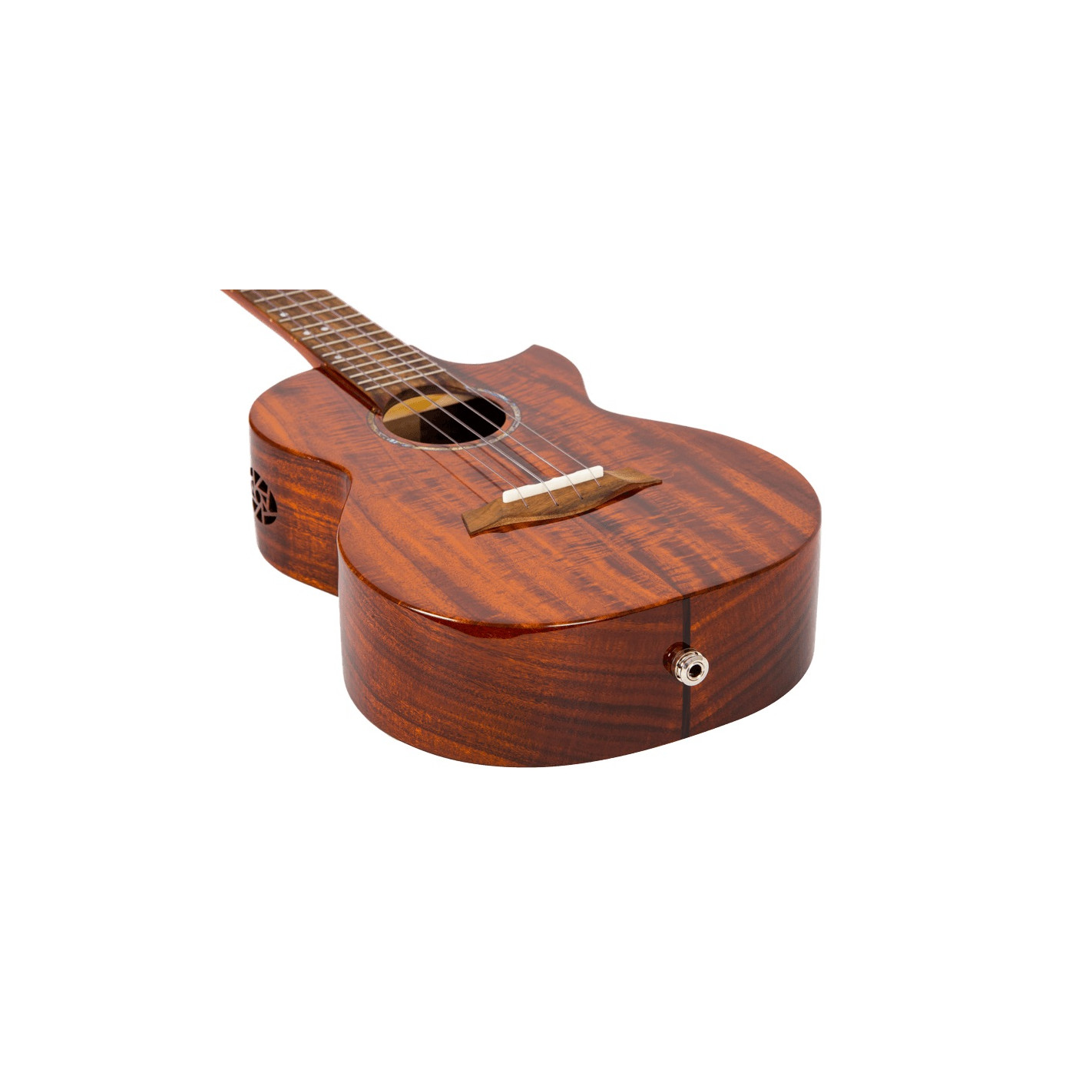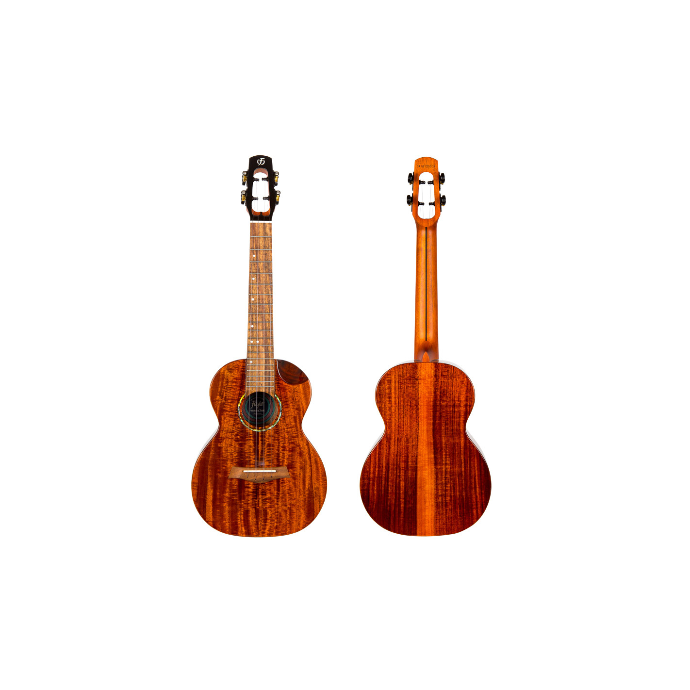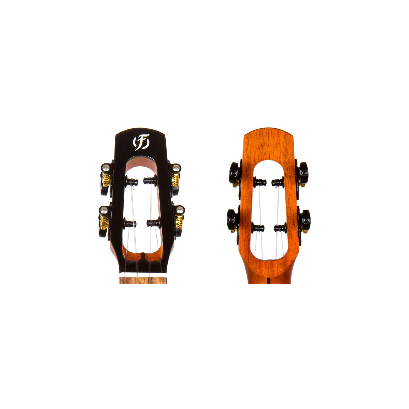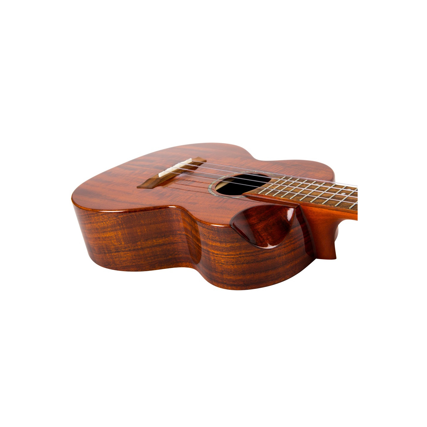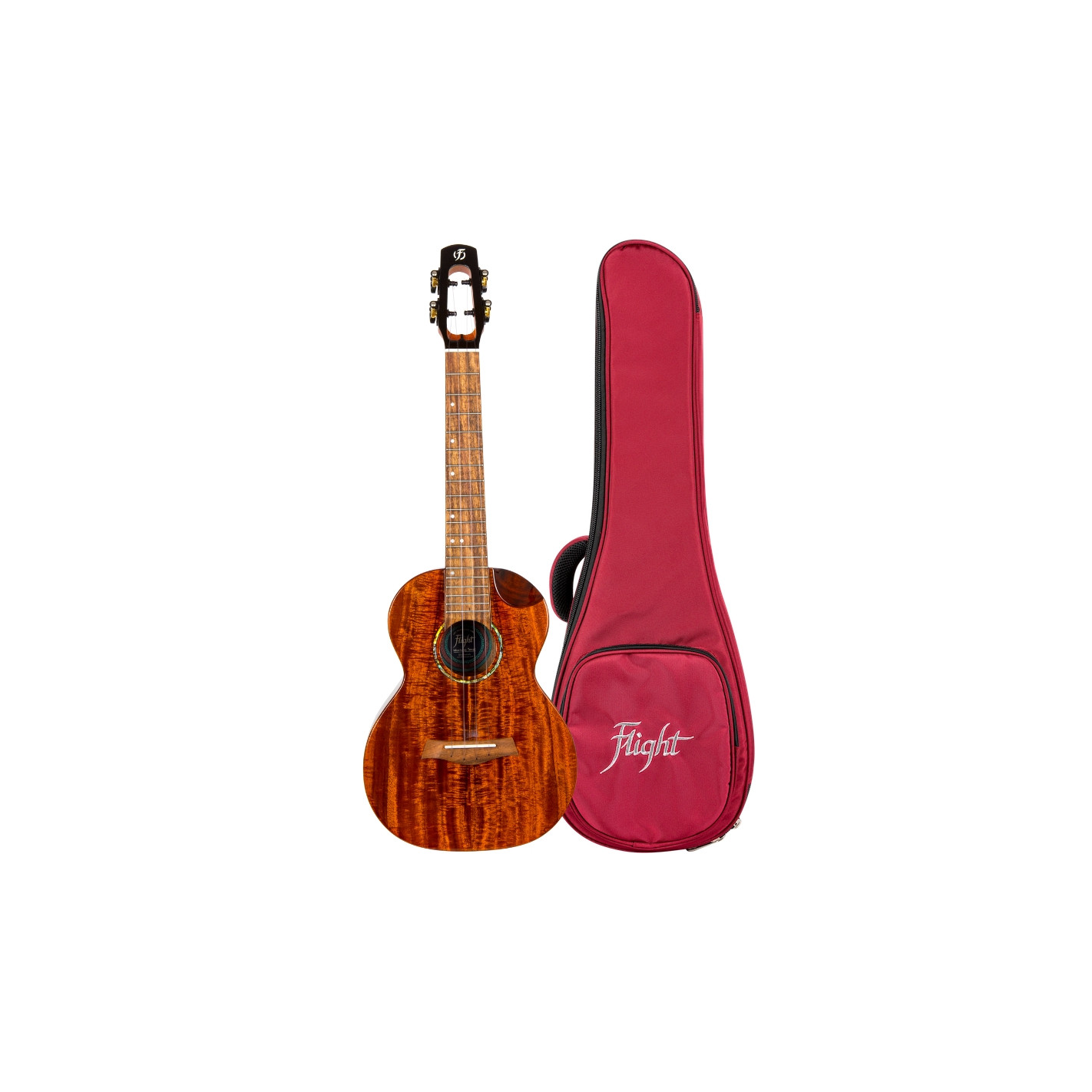 Elaborado con madera de acacia sólida con un ligero tono rojizo, el ukelele tenor Mustang de Flight cuenta con características únicas como un intrincado diseño en su agujero lateral, cutaway redondeado, marcadores de posición descentrados en su diapasón de acacia, cuerdas D'Addario y un clavijero único.