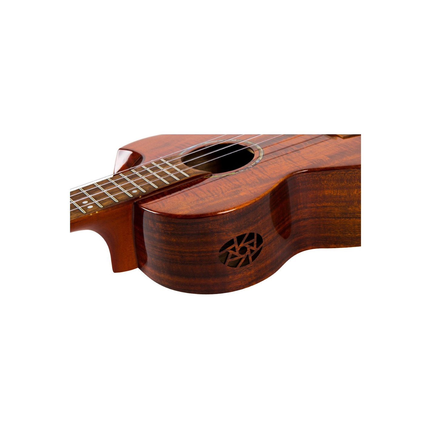 El Mustang cuenta con una de las últimas tendencias en el mundo del ukelele: el puente de cuerdas insertadas. Un elemento que hace que la tapa resuene mejor ya que las cuerdas están atadas directamente a ella y no al puente. Además, su cutaway redondeado permite al artista llegar sin problemas a los últimos trastes del instrumento sin comprometer su volumen y tono.