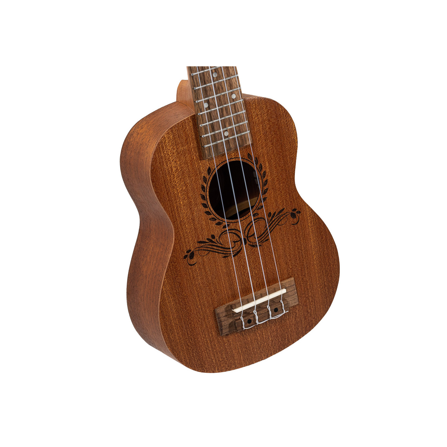 Elaborado con madera de Sapelly, este ukulele soprano cuenta con un mástil de Okume, cejuelas de hueso, puente y diapasón de nogal, y clavijeros abiertos en color negro. Su precioso acabado satinado natural atrae a cualquiera que lo mire por su preciosa roseta grabada a láser.