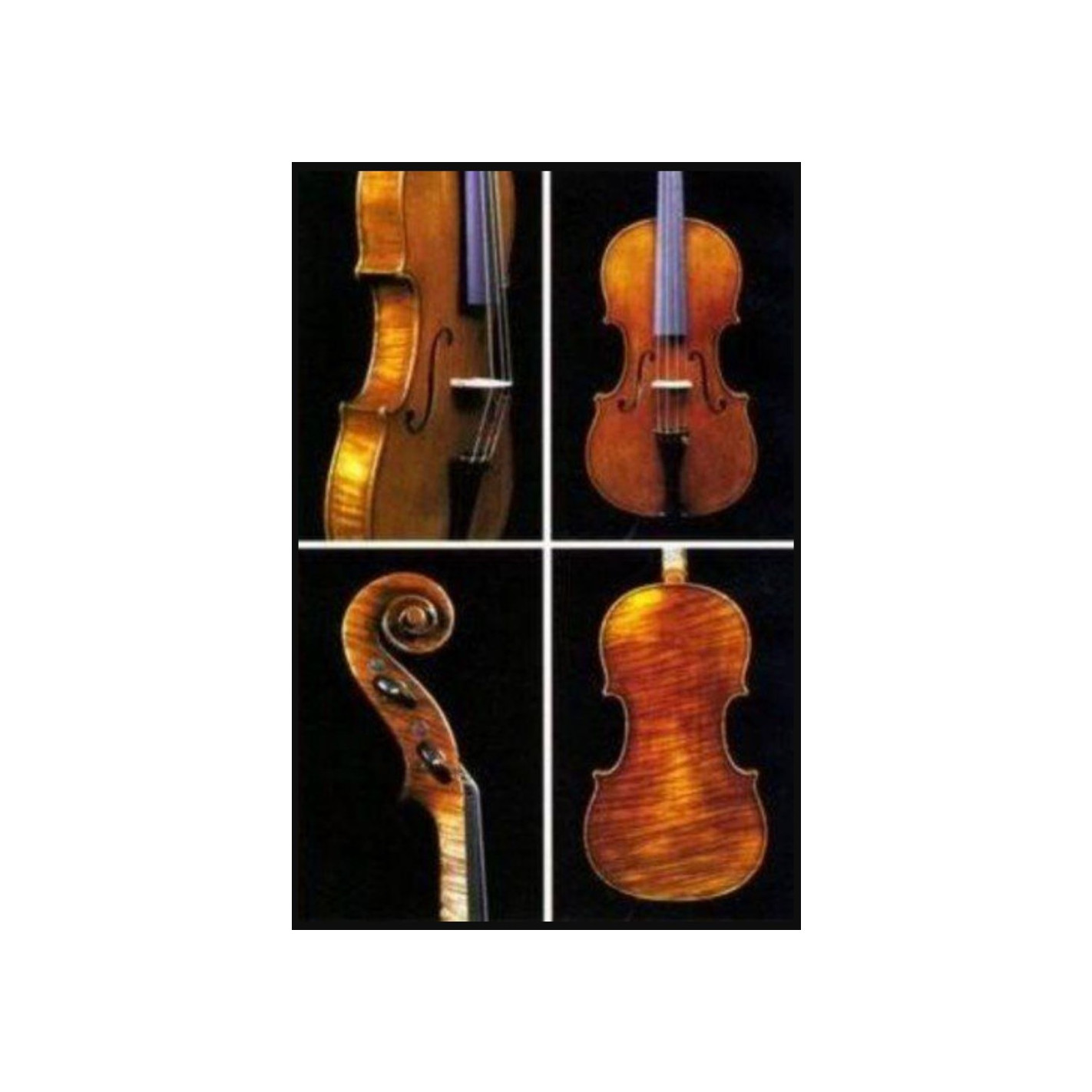 Violín de tamaño 4/4 de fabricación artesanal con tapa fabricada en madera de abeto. Fondo, aros y mástil en madera de arce veteado. Acabado de barniz antiguizado.